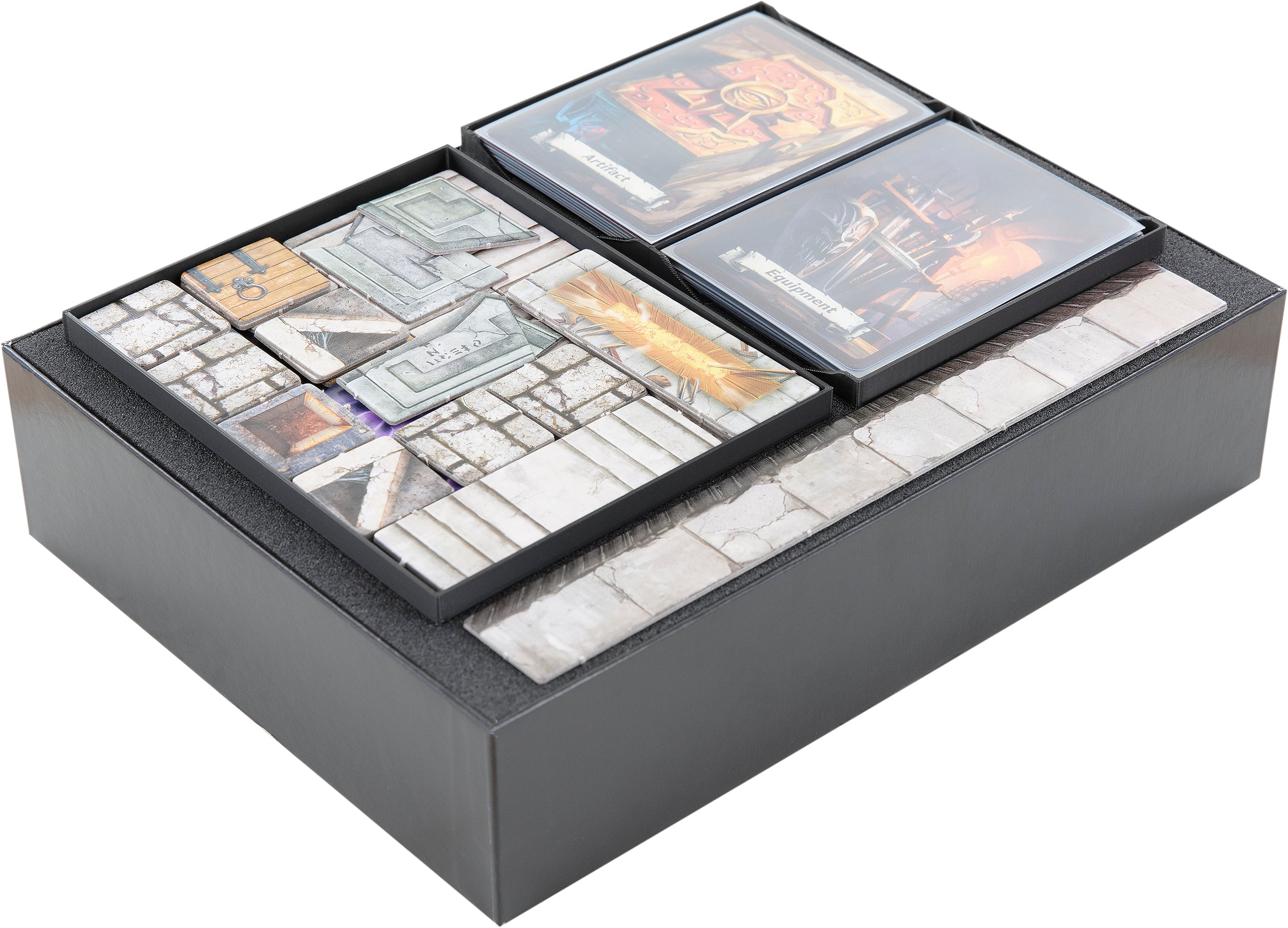 - Für das Grundspiel enthält das Set unterschiedlich hohe Schaumstoffdeckel zur Auswahl, je nachdem, ob du eine hohe oder flache Brettspielbox besitzt. Beide Versionen schließen bündig. Die Schaumstoffdeckel für beide Varianten sind im Set enthalten.