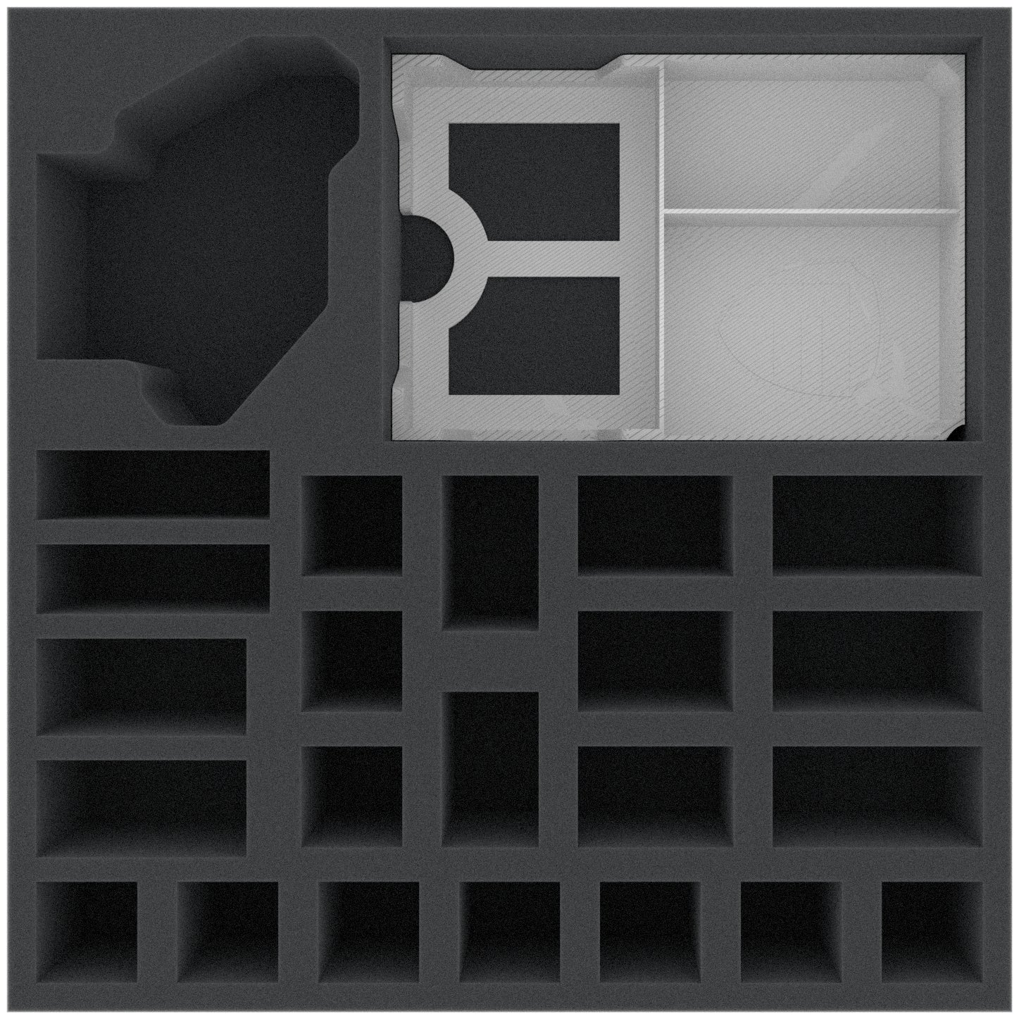 Die 60 mm hohe Schaumstoffeinlage bietet dir insgesamt 24 Fächer, in denen deine Miniaturen Zuflucht vor der eisigen Kälte finden können. Dabei spielt es keine Rolle, ob es sich um Söldner, Yetis oder die beiden Türen handelt, jede Miniatur erhält eine passende Schaumstoff Höhle. Der „Eisige Schrecken“ wird sogar in einem miniaturengenau geschnittenen Fach in den sicheren Kälteschlaf geschickt.