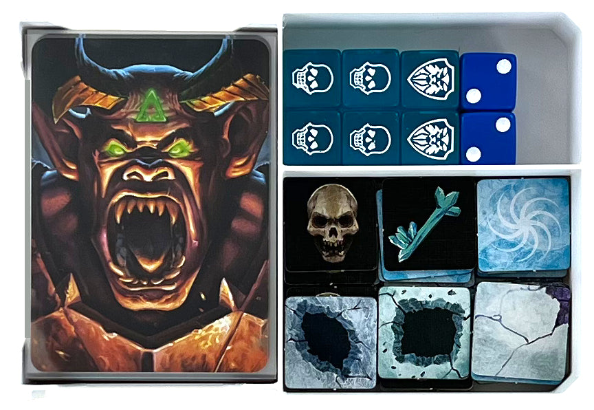 - 1 Kartenhalter aus Kunststoff mit drei Fächern für die Spielkarten wie Helden, Gegner, Söldner, Ausrüstung, Schätze, Artefakte und Schreckenszauber, sowie für kleinteiliges Spielmaterial wie Bewegungs- und Kampfwürfel, Marker wie magisches Eis, Eistunnel, Glatteis, Eisgewölbe, Kristallschlüssel, blockierte Felder und Totenkopf-Plättchen