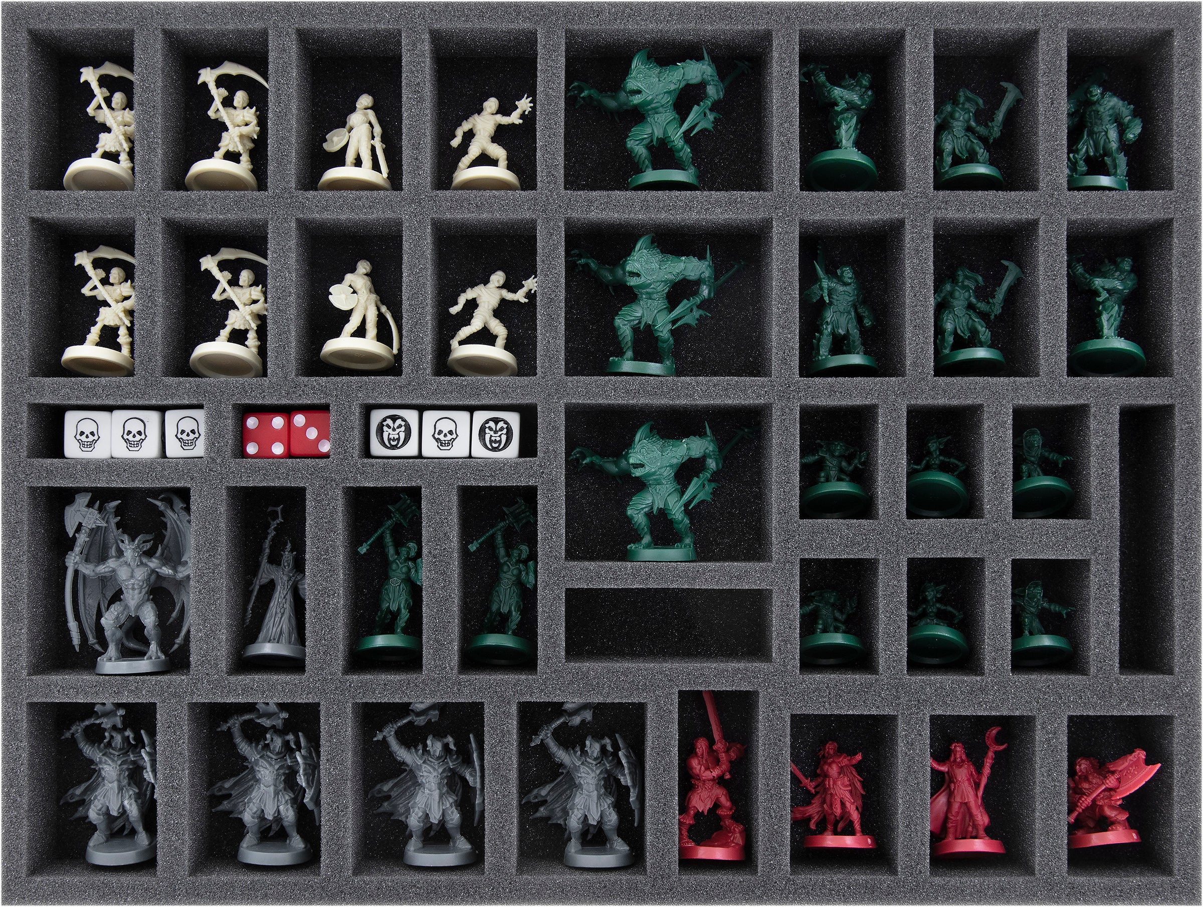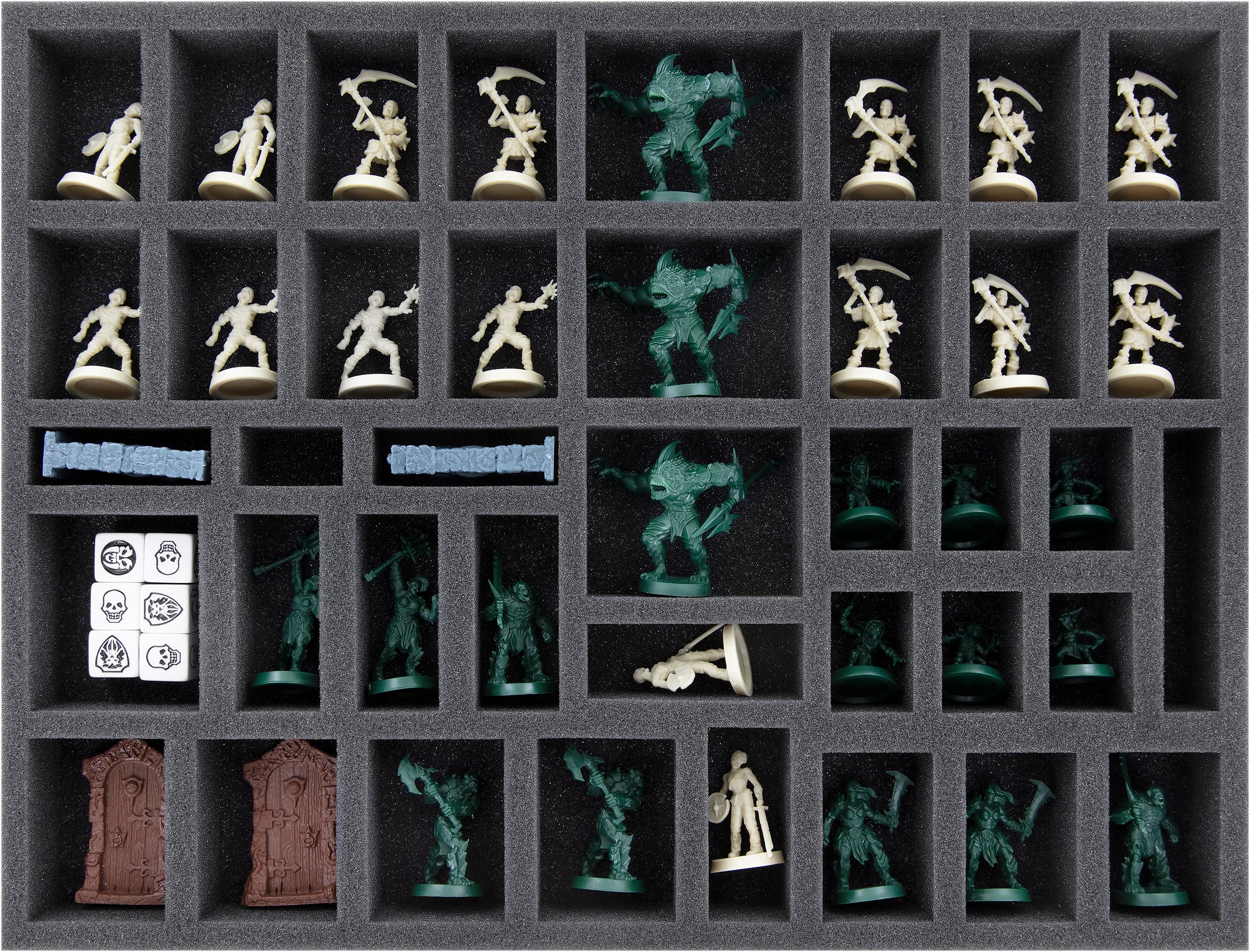 Vier Schaumstoffeinlagen stellen sicher, dass sämtliche deiner Miniaturen und Geländeteile gut geschützt verstaut sind. Dabei verteilst du die Modelle, Türen und Möbelstücke des Grundspiels auf zwei Einlagen, während sich die Miniaturen und Geländeteile der Erweiterungen „Die Bastion Kellars Keep“ + „Die Rückkehr des Hexen-Lords“ eine Einlage teilen. Die Figuren aus „Der eisige Schrecken“ erhalten eine 60 mm hohe Schaumstoffeinlage zum Schutz.
