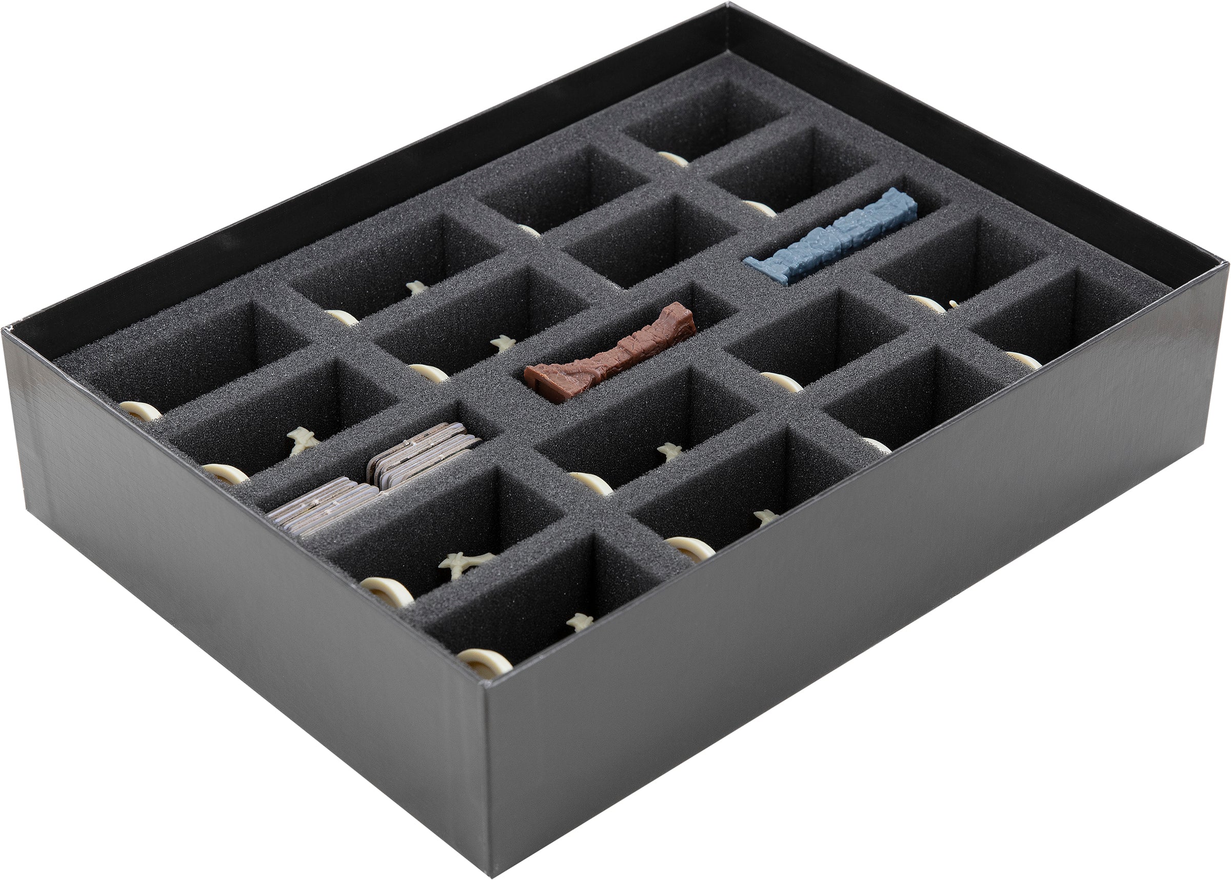 - Die Tokenhalter aus robustem Kunststoff bieten Platz für kleinteiliges Spielmaterial. Kartenhalter kümmern sich um die Spielkarten, während die Figuren, Geländeteile und Tore in den Schaumstoffeinlagen optimalen Schutz finden.