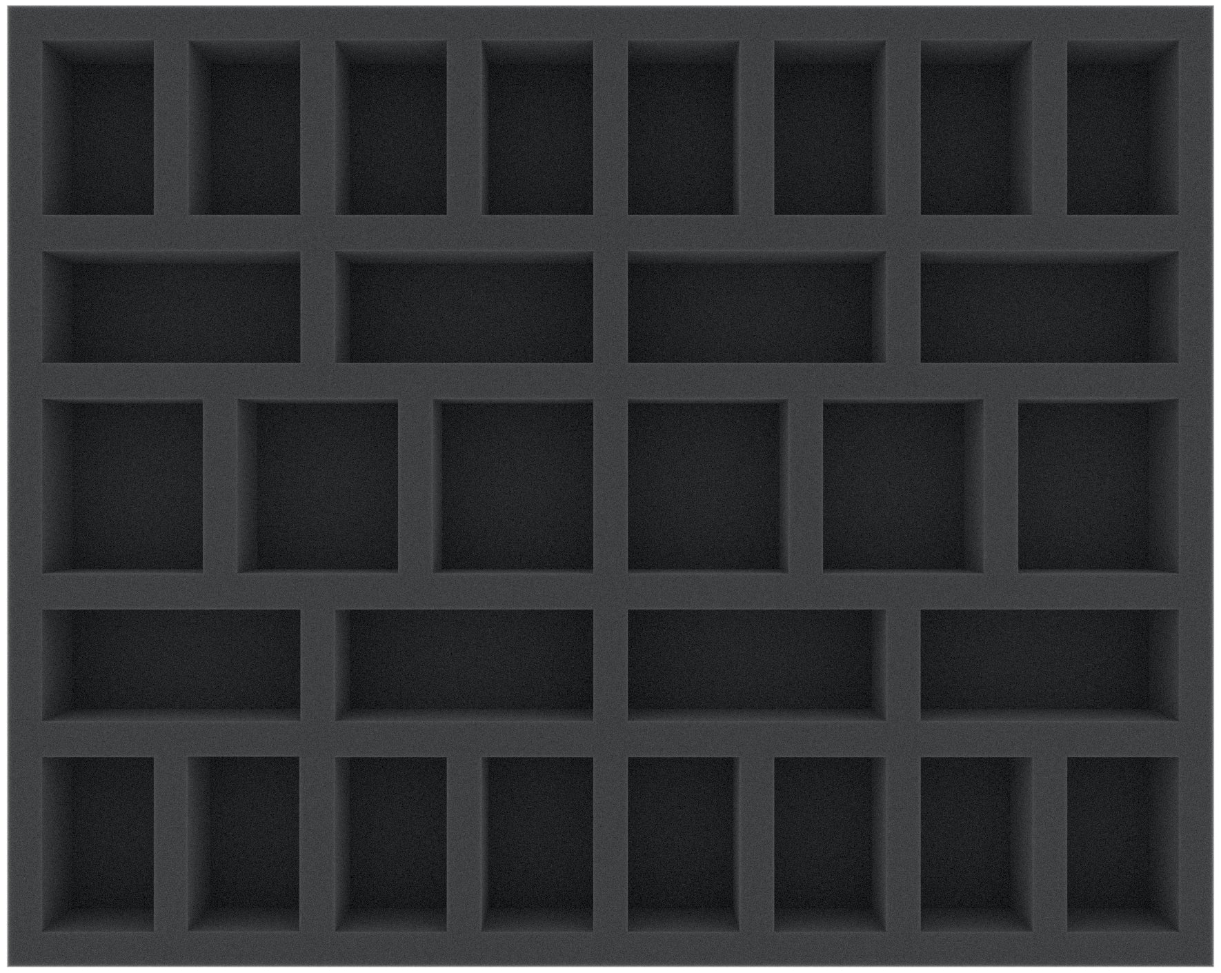 Diese Feldherr Schaumstoffeinlage verfügt über 30 verschieden große Fächer zum sicheren Aufbewahren von "Infinity The Game" Miniaturen auf 25 mm Bases.