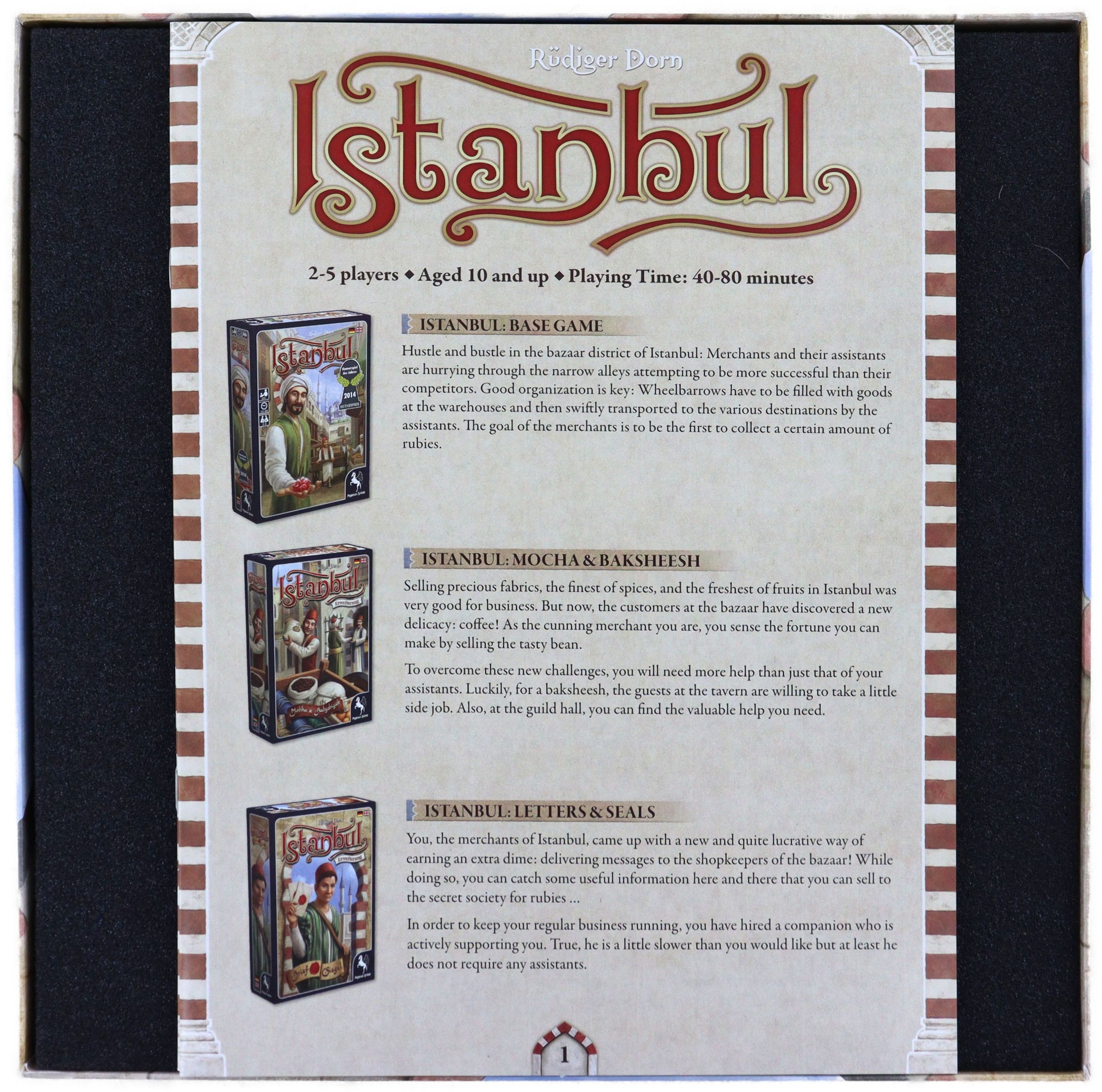 • Er bietet Platz für das gesamte Spielzubehör, einschließlich dem Grundspiel und den Erweiterungen "Mokka und Bakschisch" sowie "Brief und Siegel".