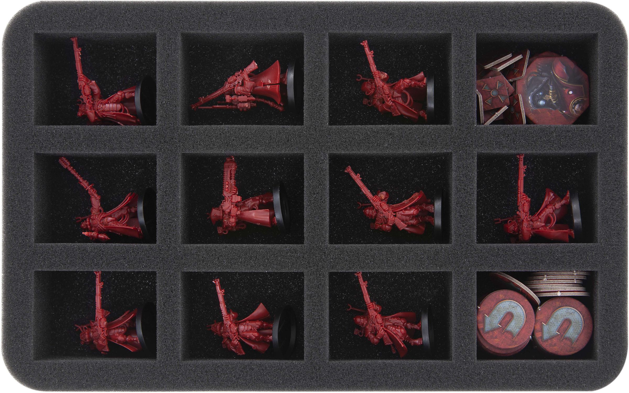 Die Einlage ist unterteilt in 12 Fächer, in denen die Skitarii-Modelle deines Adeptus Mechanicus Kill Teams bestens aufgehoben sind. Umgeben von Schaumstoff sind die empfindlichen Antennen genauso sicher vor Beschädigung, wie Radium-Karabiner und Galvanisches Gewehr. Die passgenauen Fächer sorgen außerdem dafür, dass die Figuren nicht umherrutschen oder aneinanderstoßen. Das erhält die Farben bemalter Skitarii-Krieger.