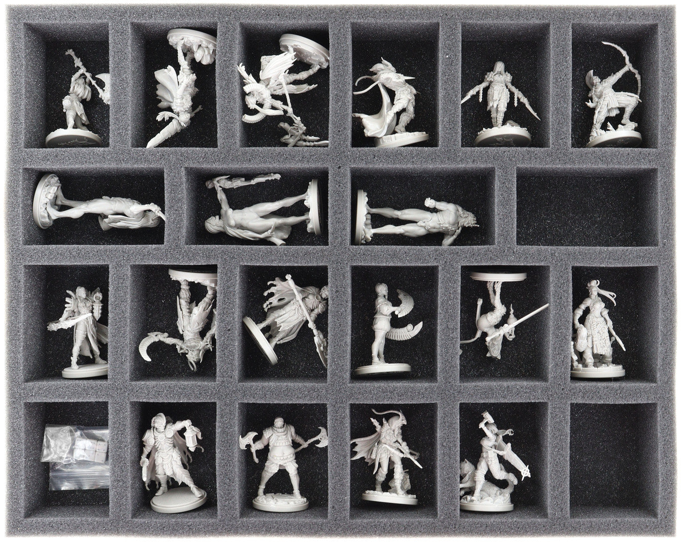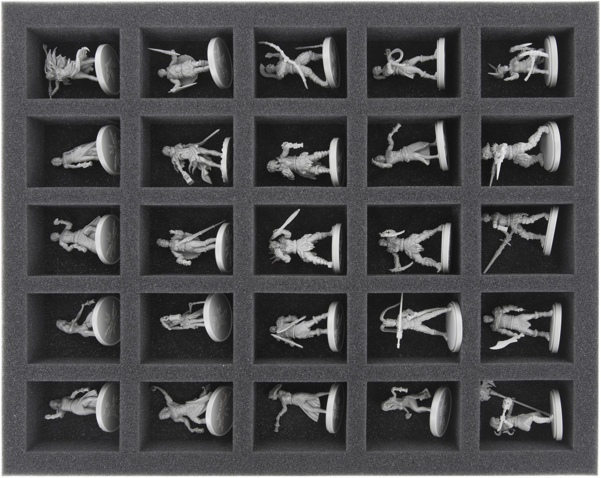 - 1 Full-Size Schaumstoffeinlage mit 25 Fächern für Standardminiaturen wie Mad & Mighty Striker, Cursed Spear, Father & Son, Dead Survivor und Modelle mit ähnlichen Abmessungen (FSLQ040BO)