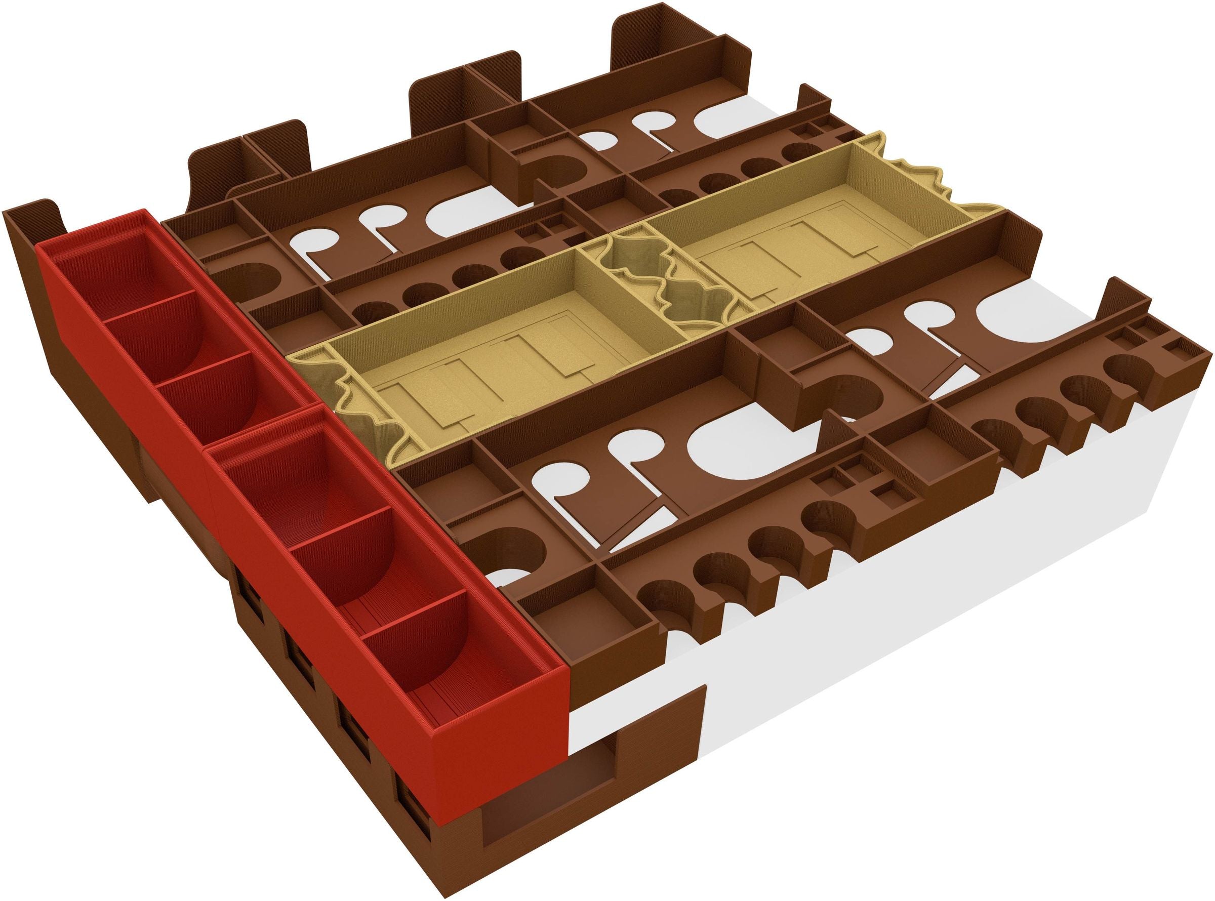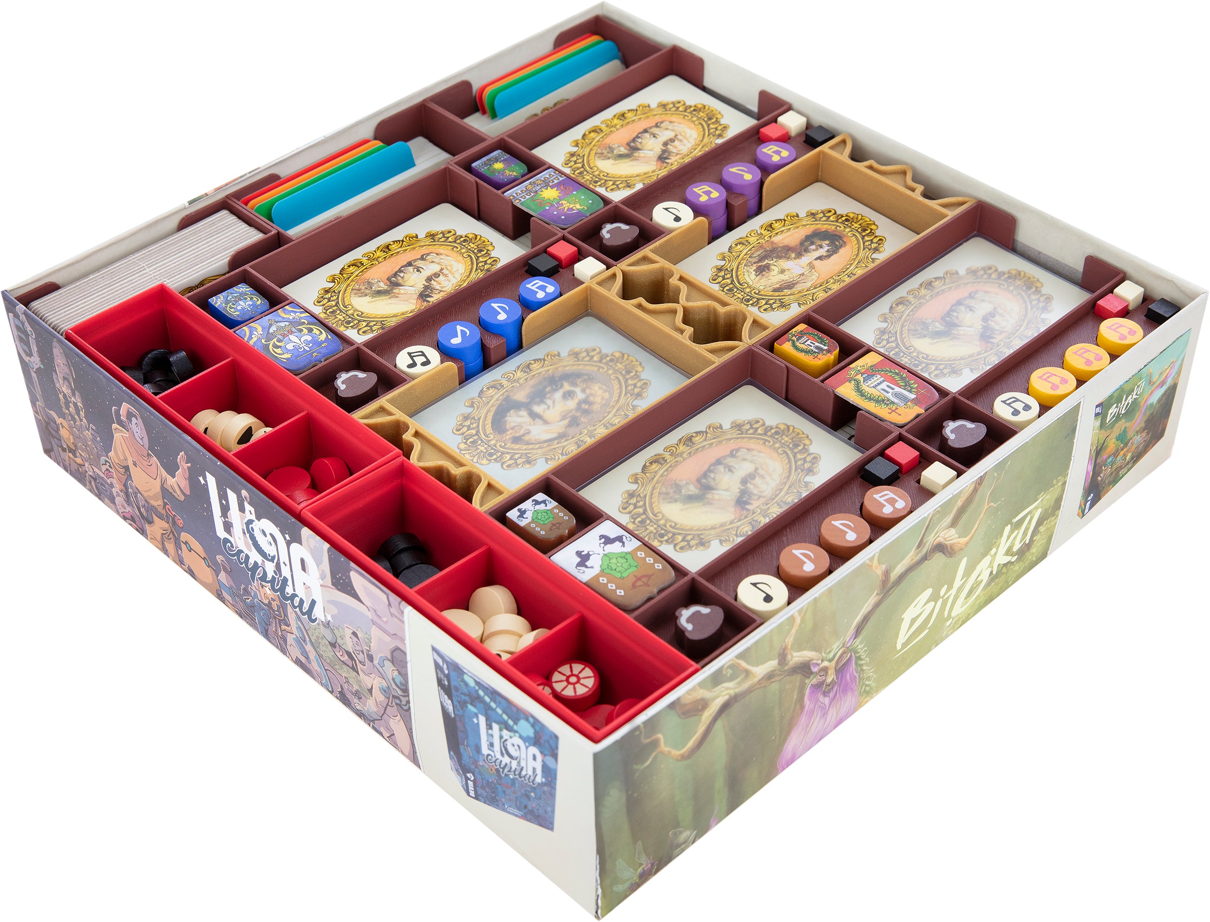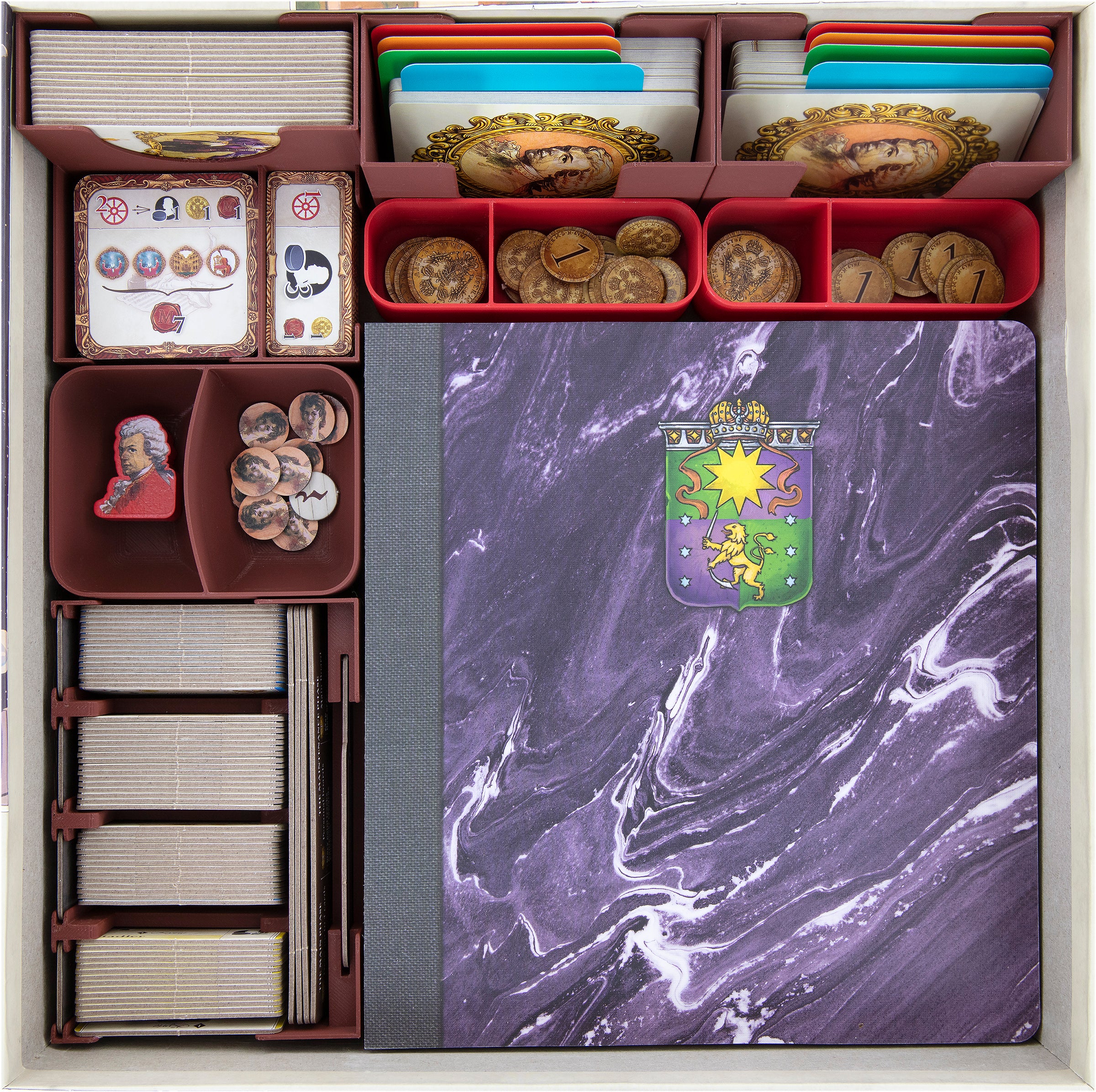 Die einzeln entnehmbaren Einsätze halten nicht nur den Inhalt deiner Brettspielbox im Zaum, sondern sorgen auch auf dem Spieltisch für Ordnung. Ressourcen Trays und Münzhalter sind in doppelter Ausführung vorhanden, damit die Spieler sich nicht zu weit nach den Spielmaterialien strecken müssen.
