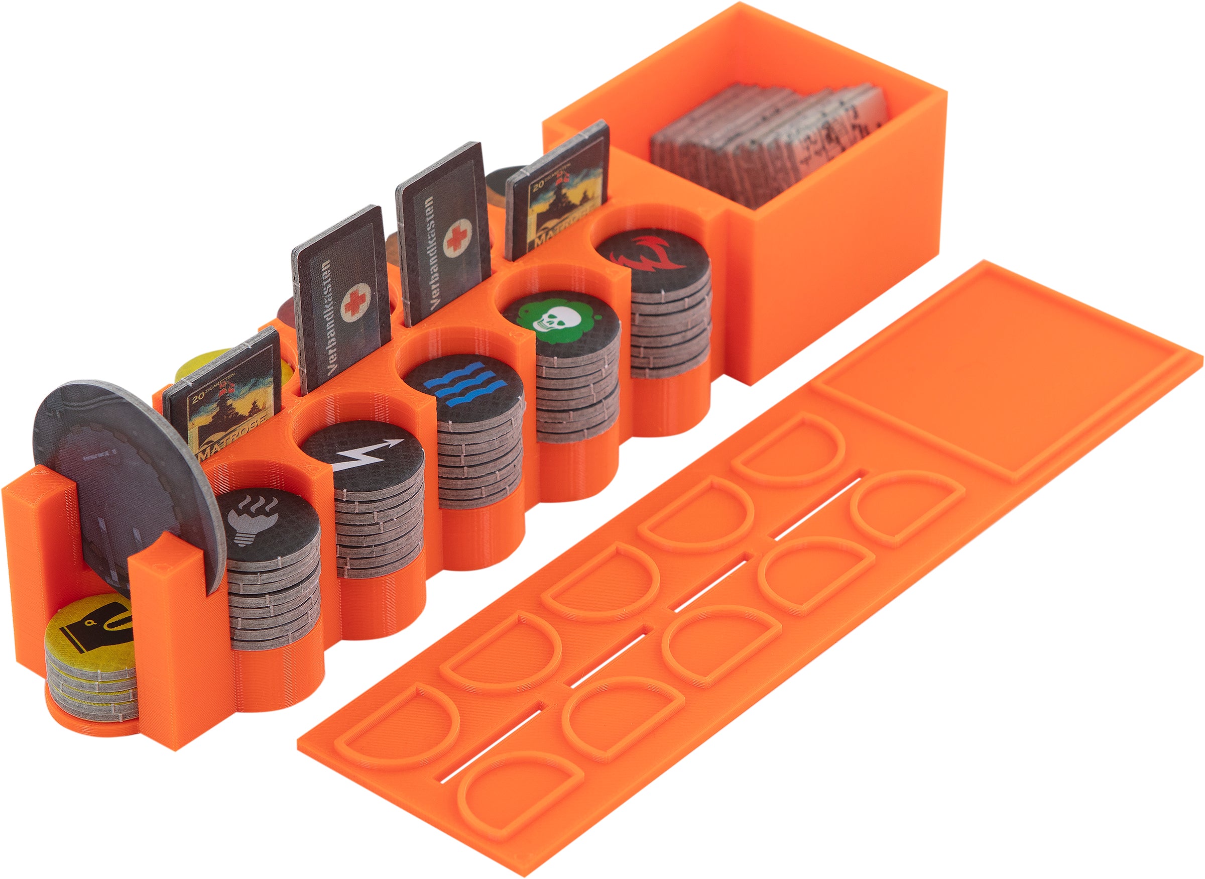 Zu Spielbeginn holst du einfach nur die Token-Boxen, Karten und Spielmaterialien aus der Einlage und verteilst sie auf dem Spieltisch an deine Mitspieler. Zeitaufwendiges Ordnen und Arrangieren kannst du dir nun sparen.