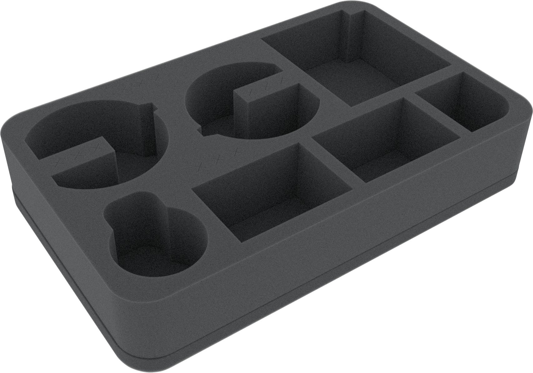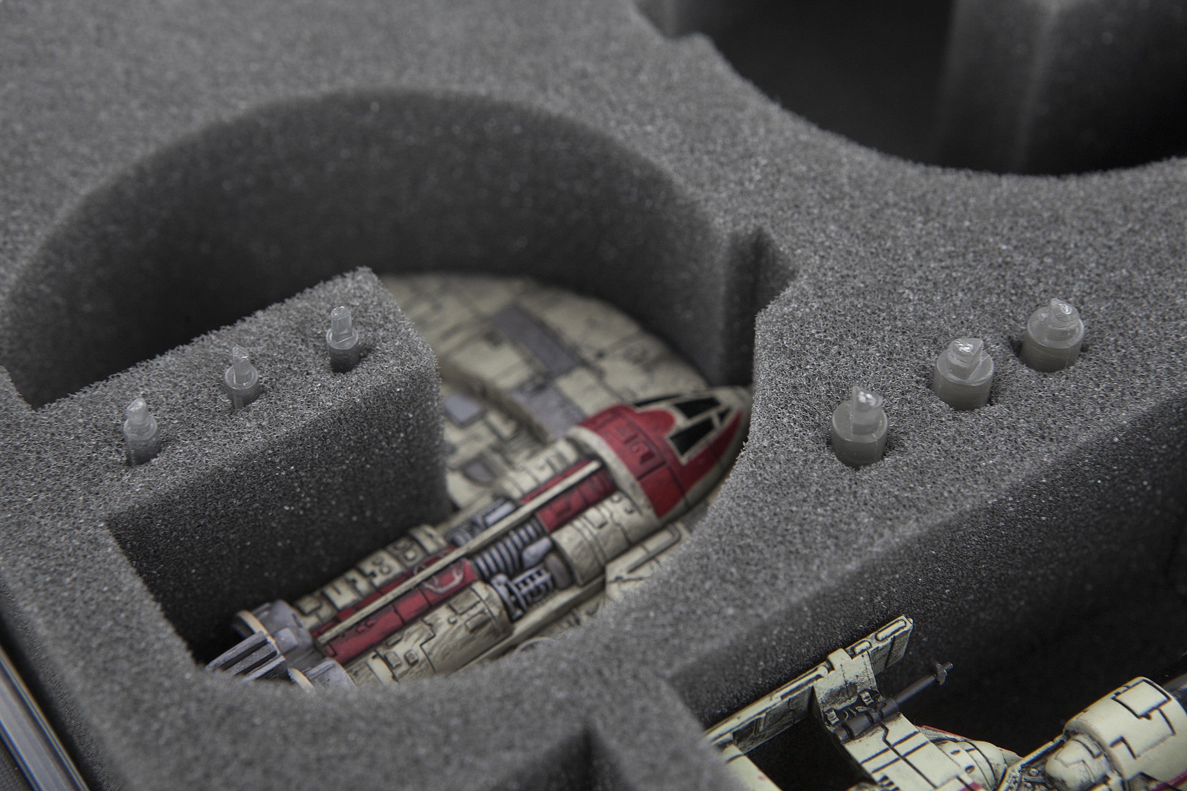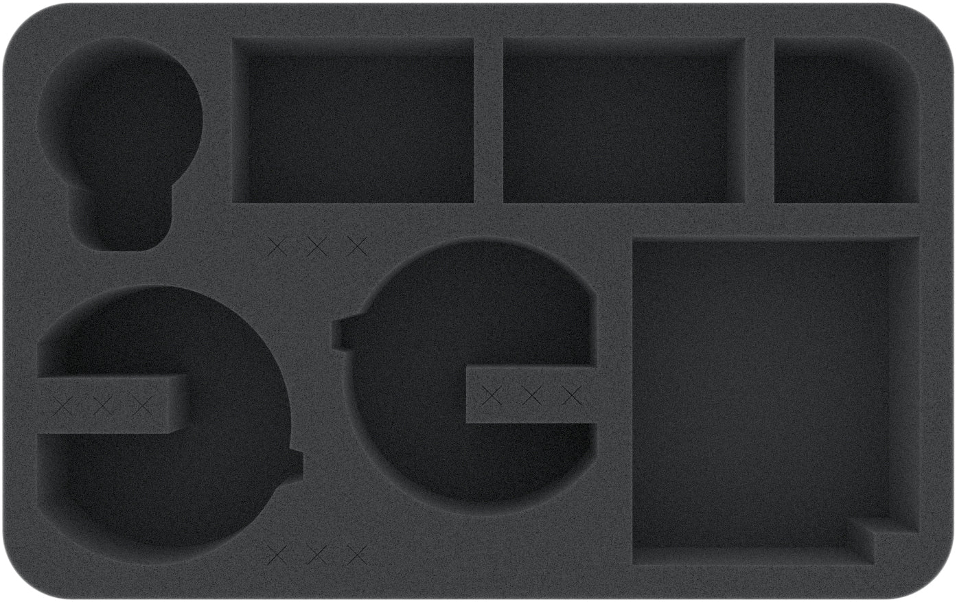 Diese Feldherr Half-Size-Schaumstoffeinlage wurde speziell für zwei Star Wars X-Wing JumpMaster 5000 angefertigt. Zwei Modelle der Vollstrecker Eins können hier sicher aufbewahrt und transportiert werden. Zusätzlich passen noch bis zu 3 Jäger und das Zubehör in das Insert. Die Base-Ständer können in dafür vorgesehene Kreuzschlitze versenkt werden.