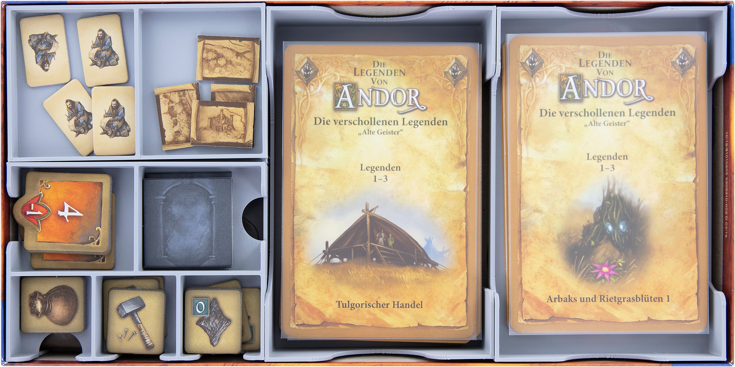 Neue Legenden brauchen neue Komponenten - und so fügt diese Erweiterung dem Andor-Zyklus Rietgras, Stärkepunkte, Werkzeuge, Feuer- und Eisplättchen sowie diverse Schätze und natürlich neue Gegner hinzu! Hier den Überblick zu behalten ist nicht einfach, aber zum Glück hat unser Einsatz maßgeschneiderte Fächer für alle neuen Komponenten und sorgt für Ordnung in der Rietburg.