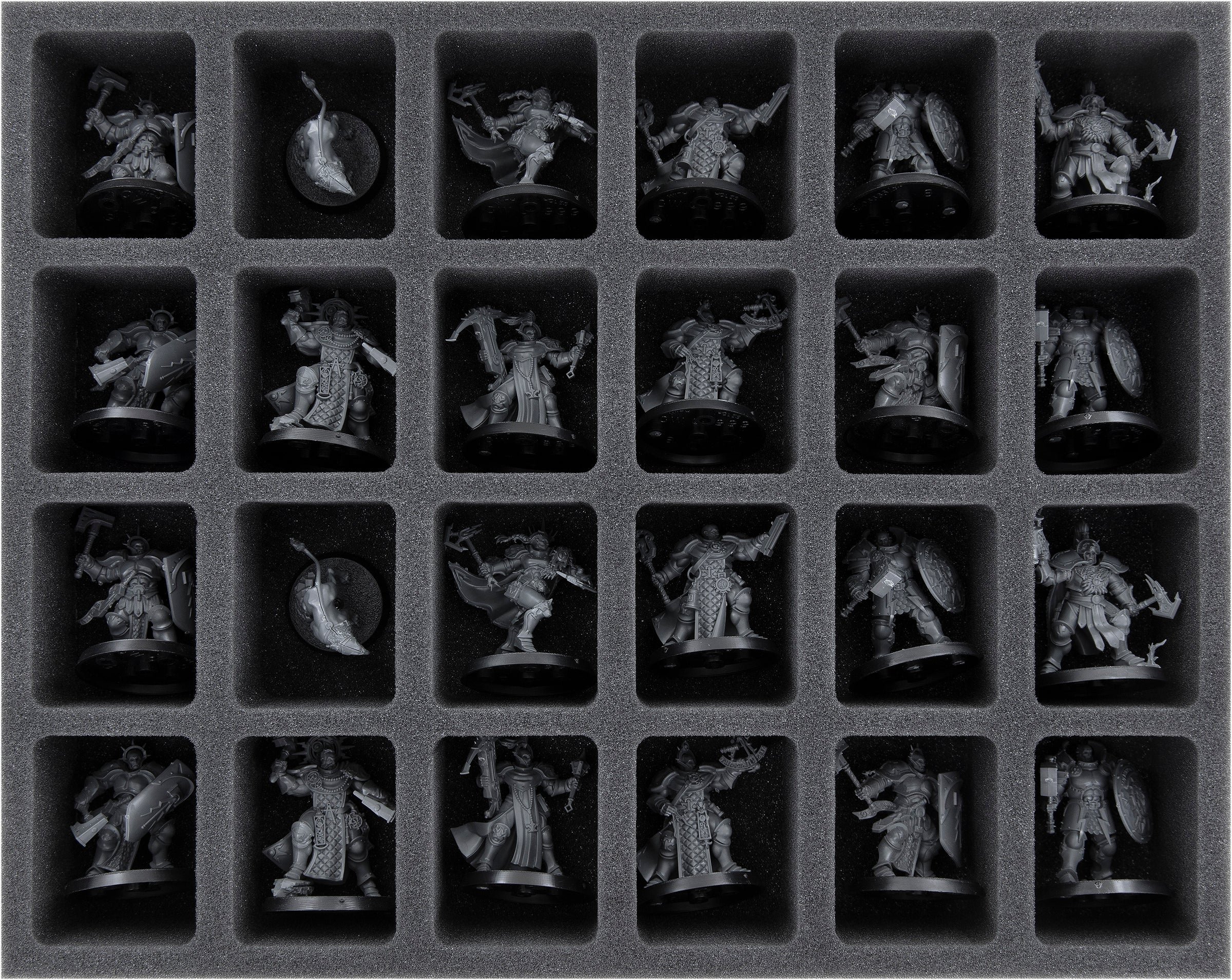 Auf dieser Full-Size-Schaumstoffeinlage hast du Platz für bis zu 24 Miniaturen deiner Armee. Das Insert eignet sich besonders gut für besondere Infanterie auf bis zu 40 mm Base wie Nurglings, einfache Seuchenhüter (ohne Kommandoabteilung wie Herald of Nurgle, Musiker und Standartenträger) und Charaktermodelle wie der Pestpockige Buchhalter und Modelle mit ähnlichen Abmessungen.