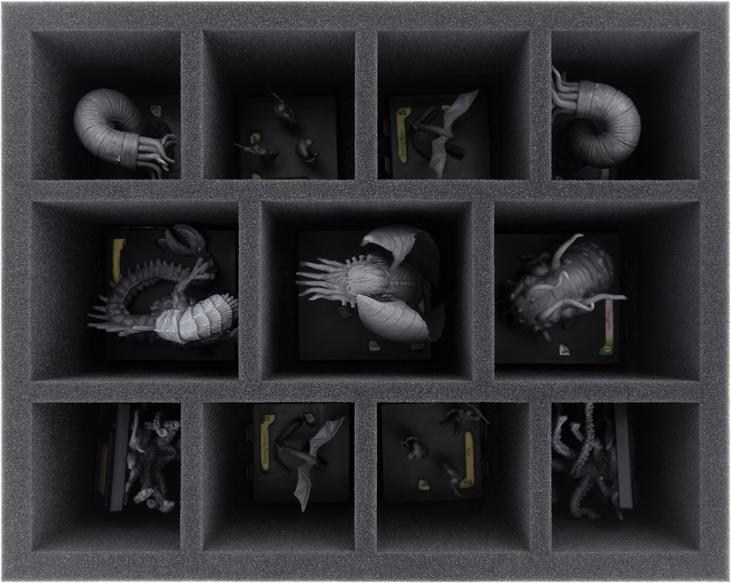 Auf der Feldherr Full-Size-Einlage mit 11 Fächern, hast du Platz für deine großen und mittleren Monsterfiguren. Drei Fächer sind ausgelegt für die Miniaturen auf großer Base, wie die Shoggothe. In den 8 kleineren Fächern kannst du die Figuren auf mittelgroßer Base (z. B. Chtonier und Sternengezücht) sicher verstauen.