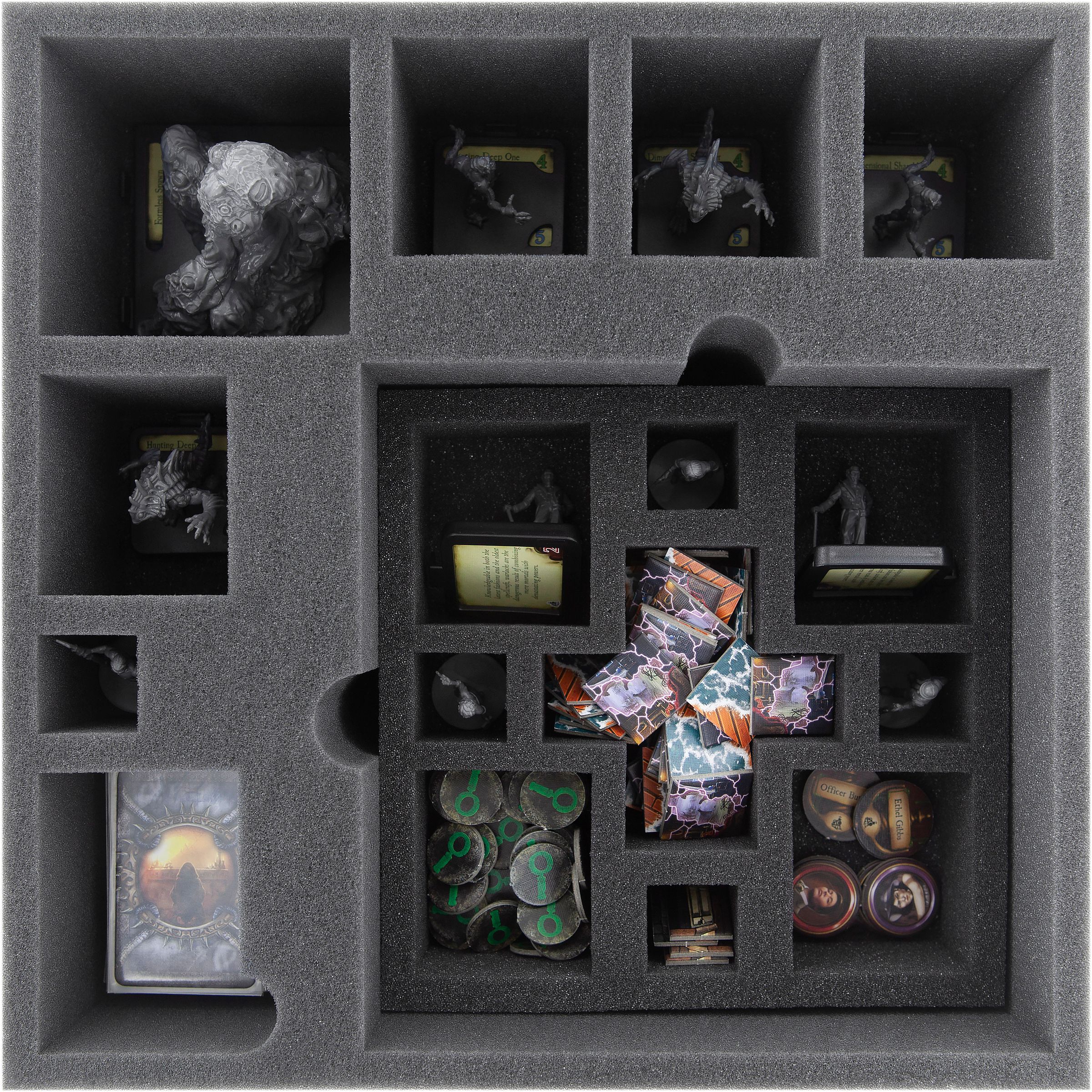 In dem separaten Inlay (ohne Boden) können 3 Ermittler-Figuren und 4 Monster-Miniaturen untergebracht werden. Jede Miniatur bekommt ein eigenes passgenaues Fach zugeteilt. Das verhindert Zusammenstöße, schützt die empfindlichen Teile vor Abbruch und bemalte Miniaturen bleiben verschont von Kratzern und abplatzenden Farben.