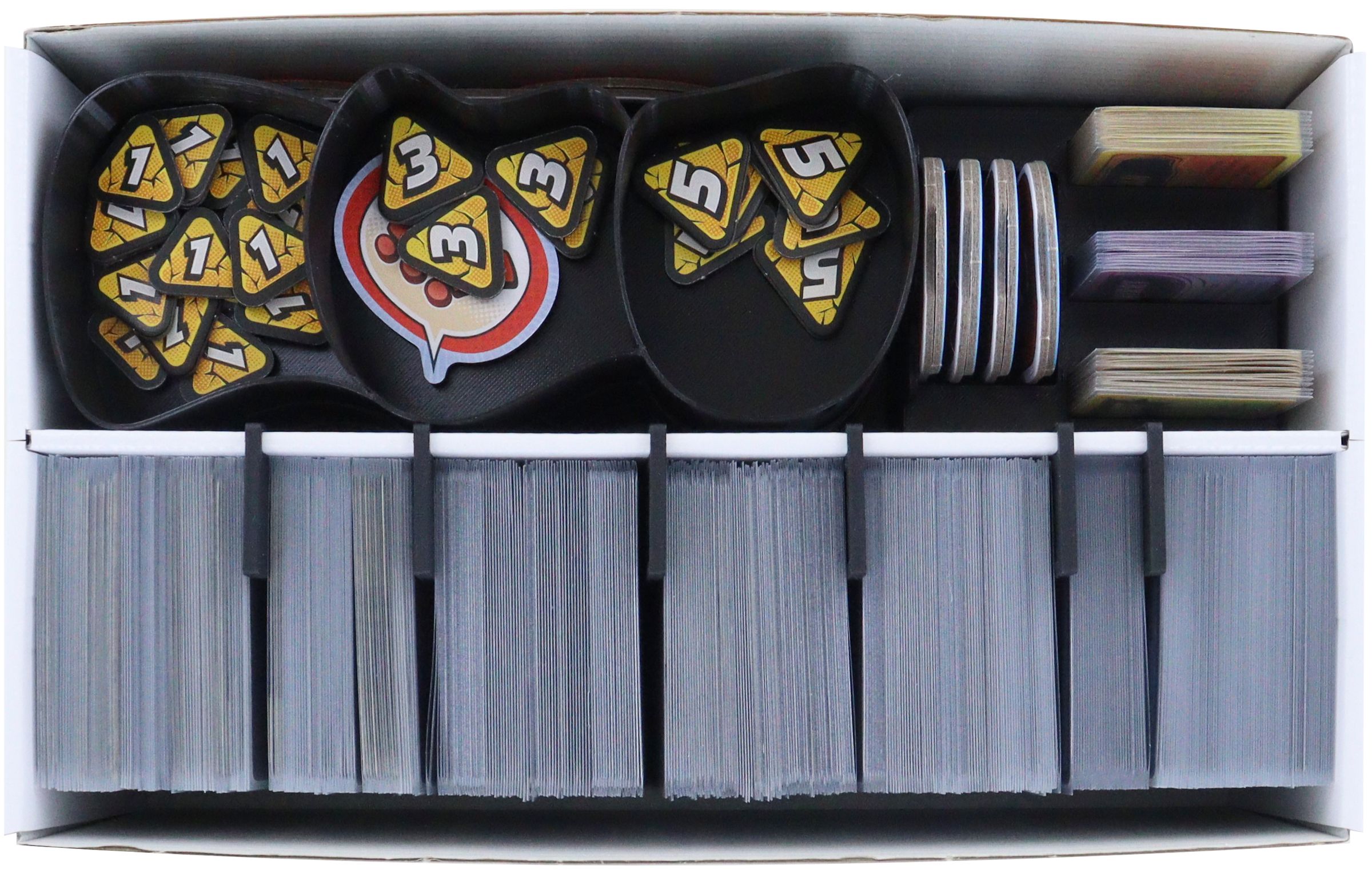 Die individuell angefertigten Karten- und Tokenhalter aus robustem Kunststoff sind alle einzeln entnehmbar und können so zu Spielbeginn auf dem Spieltisch verteilt werden.