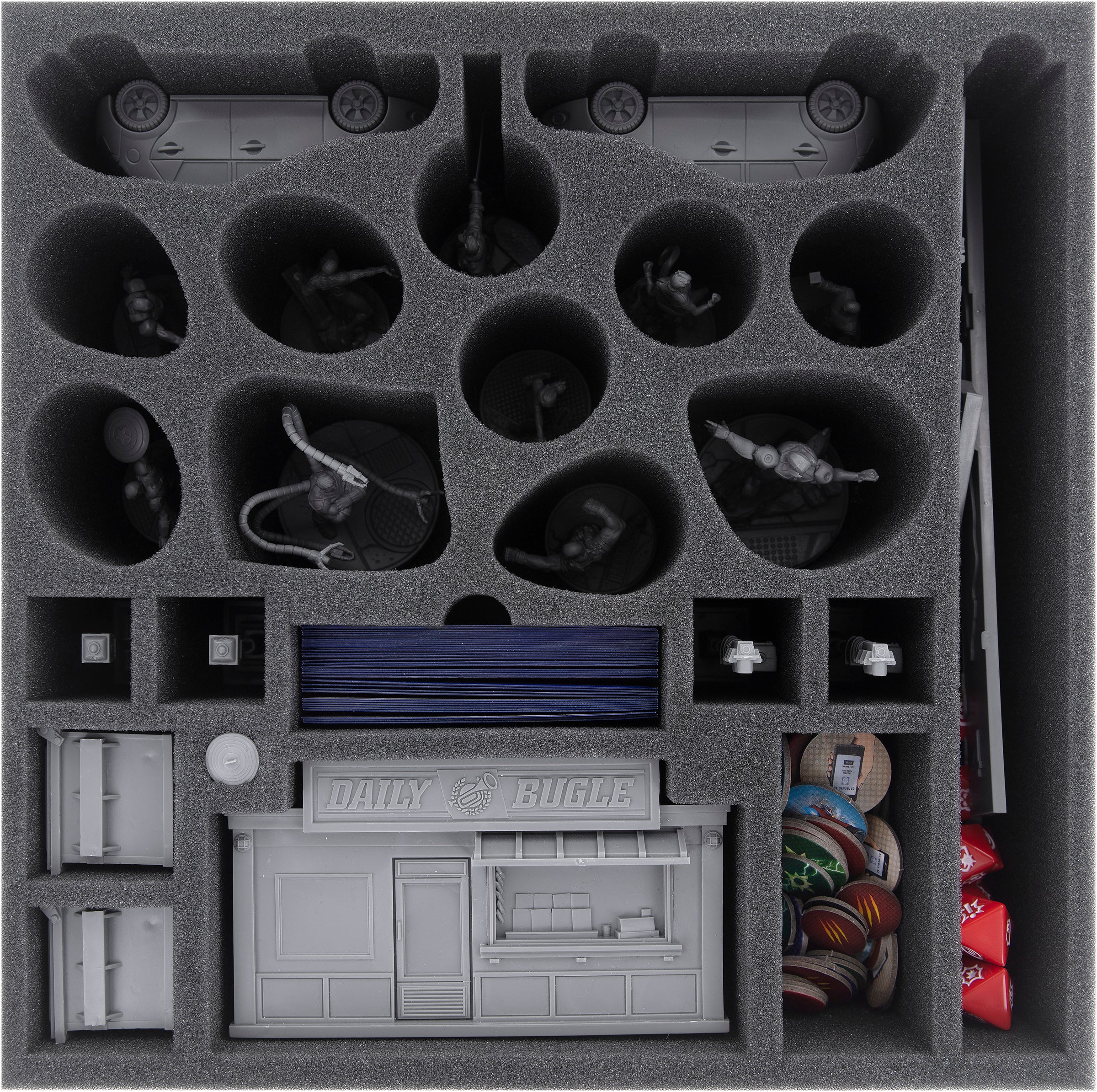 10 maßgeschneiderte Fächer sorgen dafür, dass deinen Helden und Schurken nichts zustößt. Spiderman, Black Widow, Captain Marvel und die anderen Helden-Miniaturen, bekommen hier, genauso wie Red Skull und alle restlichen Schurken, eigene passgenaue Fächer zugeteilt. So bleiben die detailreichen Miniaturen auch beim Transportieren der Box sicher an ihrem Platz.