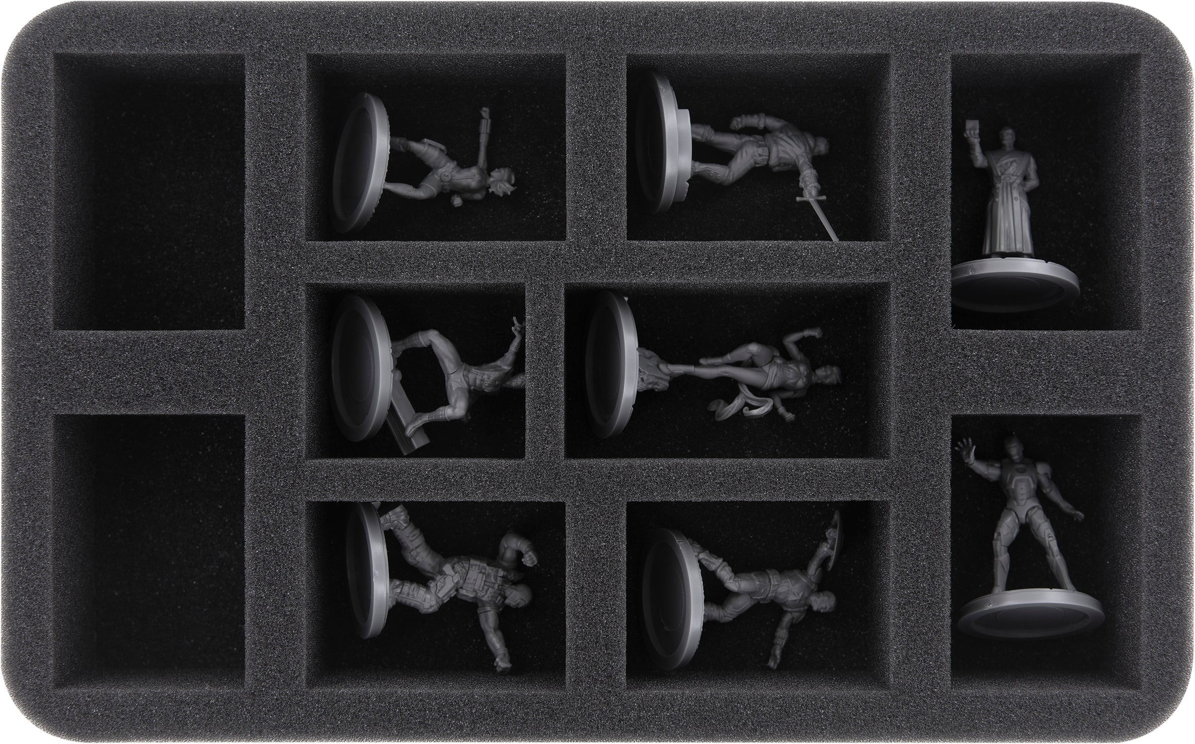 Diese Half-Size-Schaumstoffeinlage eignet sich mit ihren 10 unterschiedlich großen Fächern hervorragend um die Superhelden- und Superschurken-Miniaturen übersichtlich und bestens geschützt aufzubewahren.
