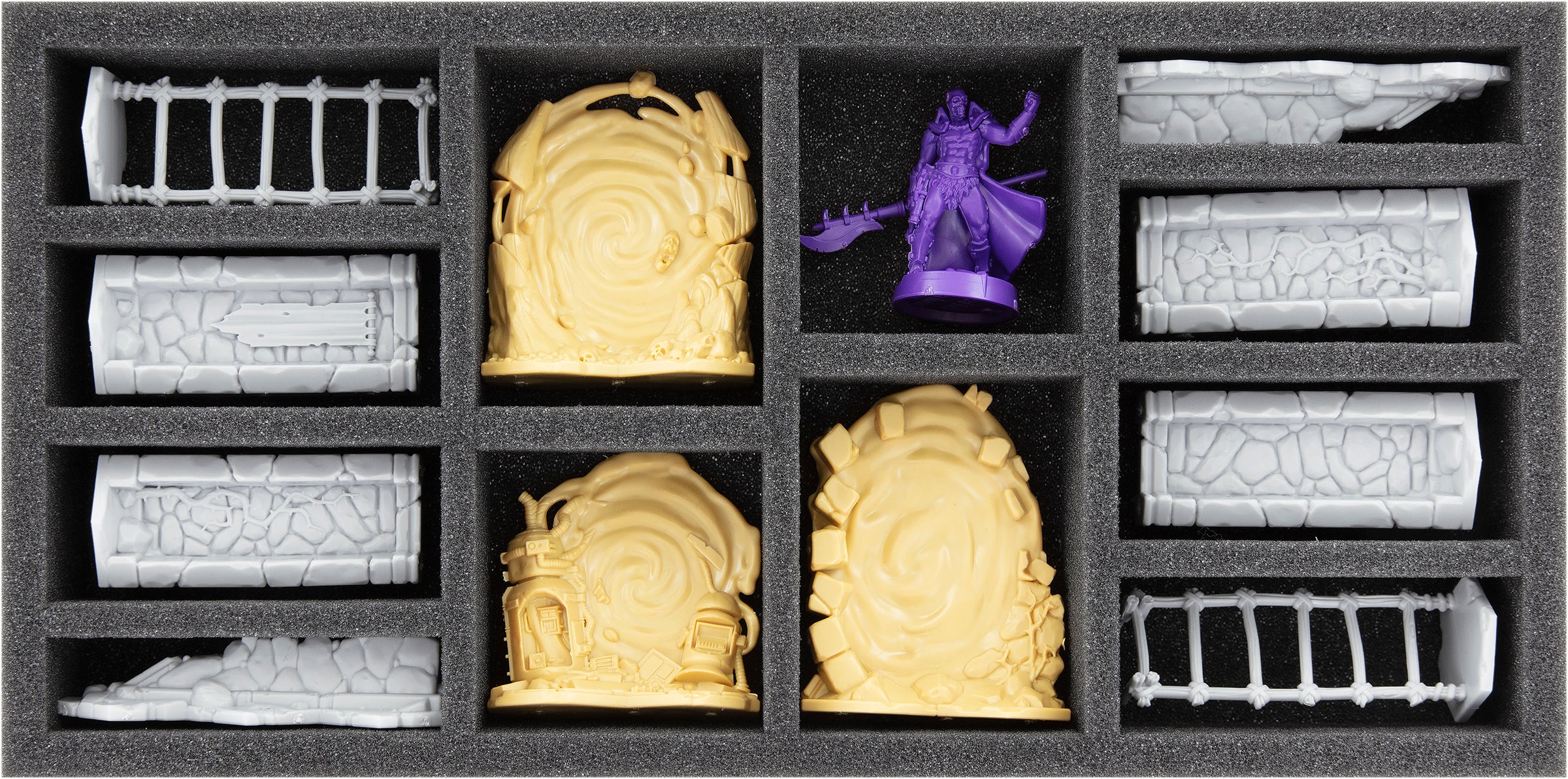 Die vier Feldherr Schaumstoffeinlagen versorgen jede Miniatur und jedes Geländestück mit einem eigenen Fach. Angefangen bei He-Man, über Skeletor bis zu den Inhalten der Erweiterungen, bekommen alle Helden, Gegner und Geländestücke ein passgenaues Fach.