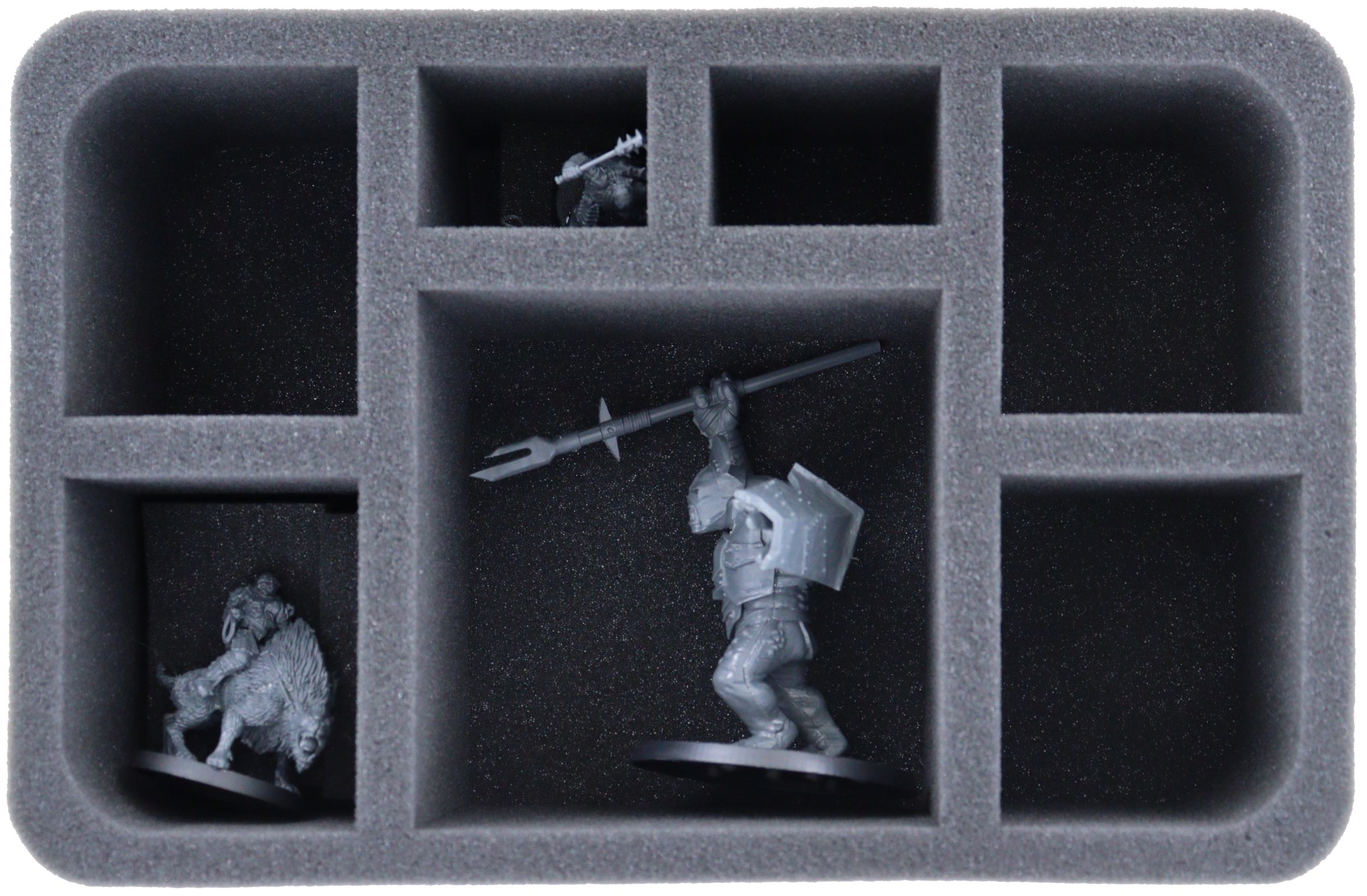 - 1 Half-Size Schaumstoffeinlage mit sieben Fächern für ausladenden Einheiten wie Gothmog auf Warg, Mordor Troll und Miniaturen mit ähnlichen Abmessungen (HSMEME090BO)