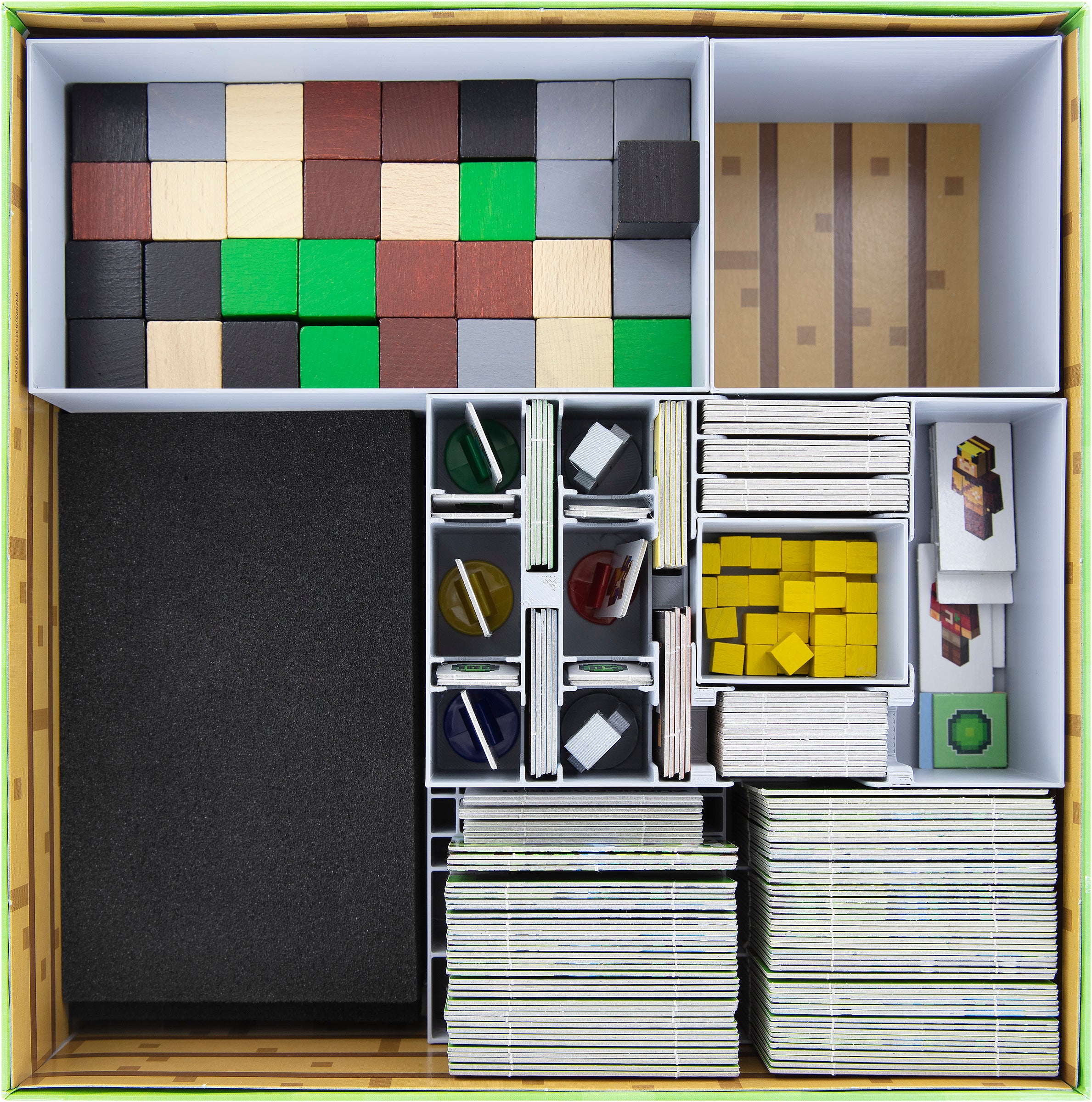 - Feldherr Organizer aus Kunststoff für das gesamte Spielmaterial des „Minecraft: Builders & Biomes“-Grundspiels und der „Farmers Market“ Erweiterung. Passt in die originale Grundspielbox.