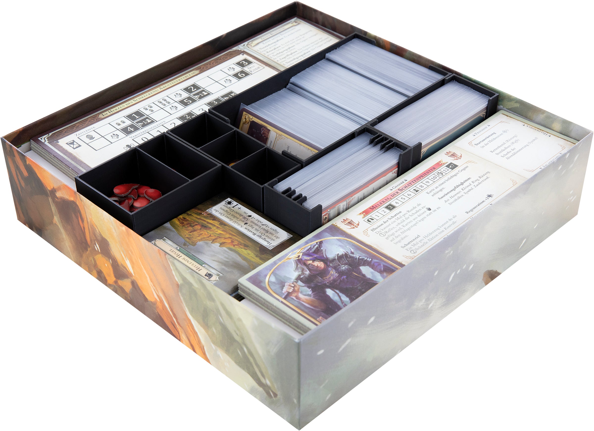 - 1 Kartenhalter aus Kunststoff mit fünf Fächern für Verbündetenkarten, Belohnungsausrüstungskarten, Endgegnerkarten, normale Begegnungskarten, Endbegegnungskarten