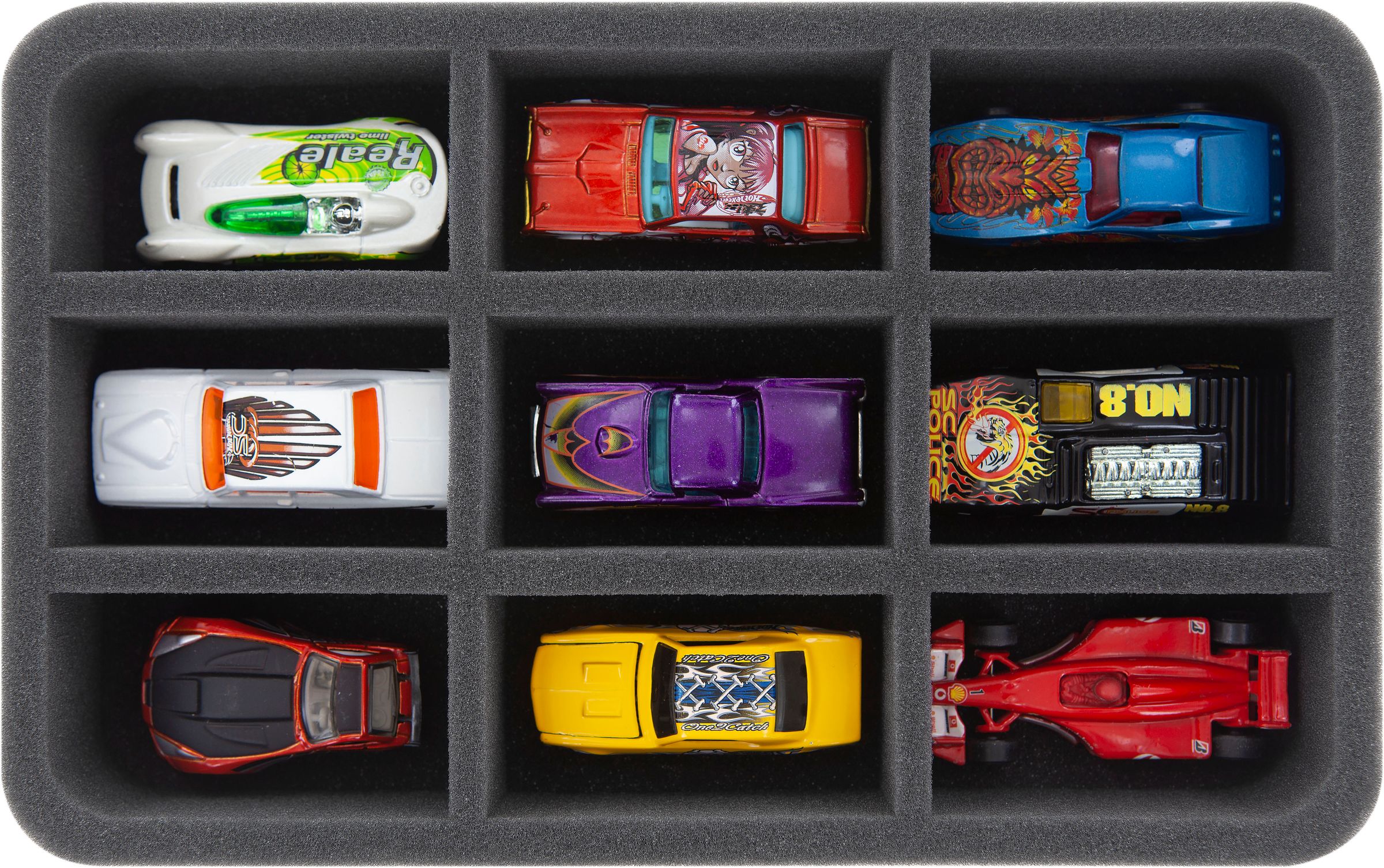 Die Schaumstoffeinlagen verfügen über jeweils neun Fächer, in denen du deine Modelle sicher und ordentlich aufbewahren kannst. Der feinporige Schaumstoff schützt deine Autos zuverlässig vor Beschädigungen – der Lack bleibt von Kratzern verschont, empfindliche Teile wie z. B. Spiegel bleiben unversehrt.