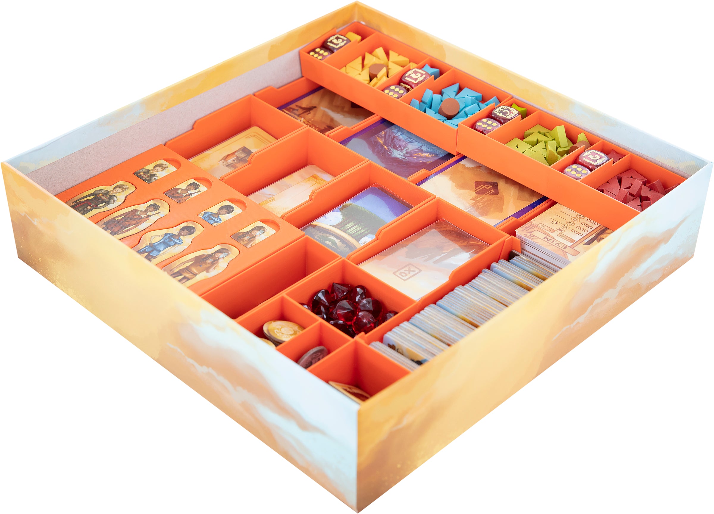 Um die Spielwelt zum Leben zu erwecken, enthält das Spiel enthält eine Fülle an Karten, Würfeln, Markern und Münzen. Damit du vor lauter Spielmaterial nicht die Übersicht verlierst, gibt es hier den passenden Feldherr Organizer aus stabilem Kunststoff, passend für deine Brettspielbox.