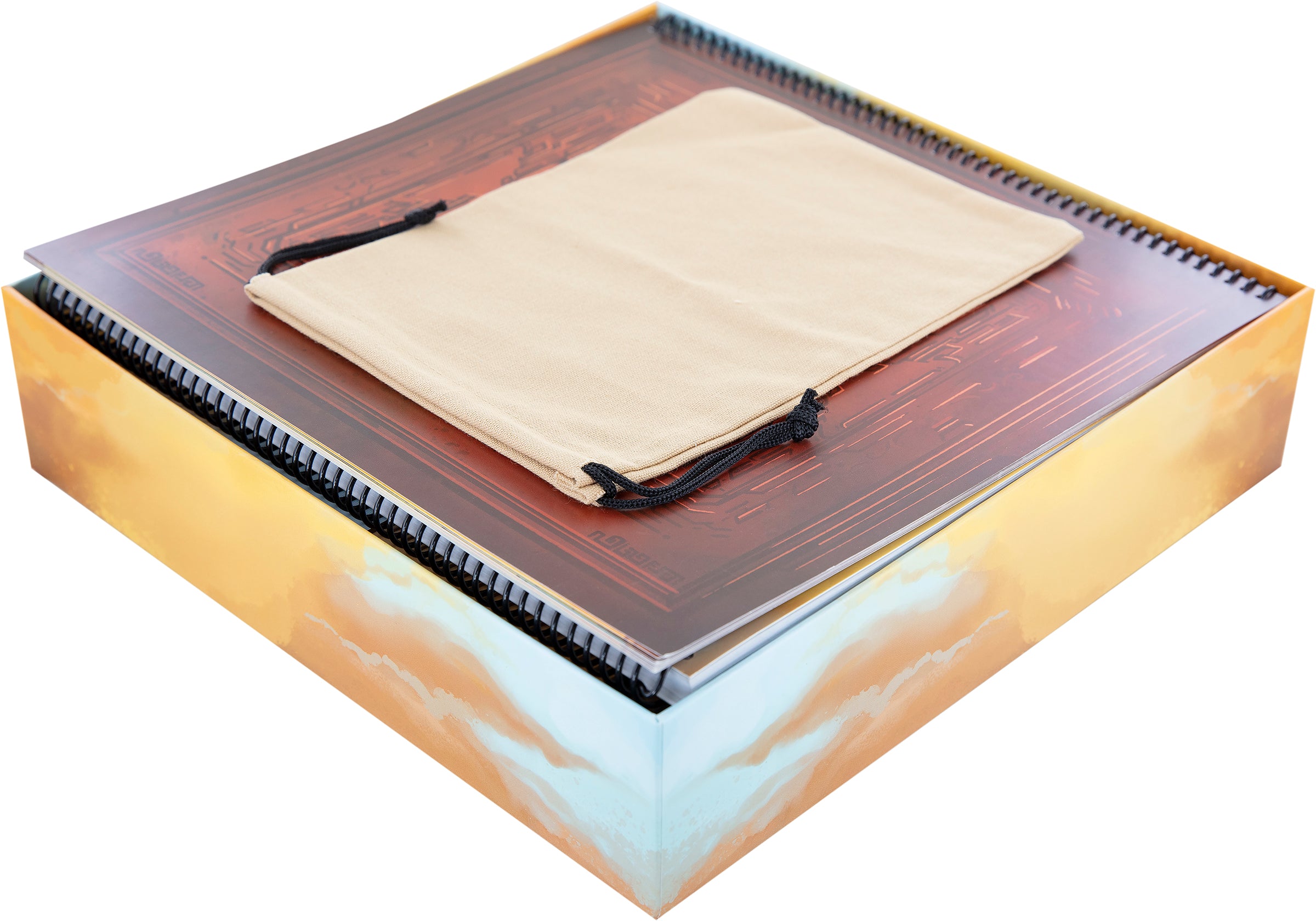 - Spielbrett, Buch der Begegnungen, Spieltableaus, Atlas, Regelheft, Neuer Laden Plättchen, Neue Mine/Hütte des Mystikers Plättchen, Stoffbeutel werden separat auf dem Schaumstoffdeckel aufbewahrt.