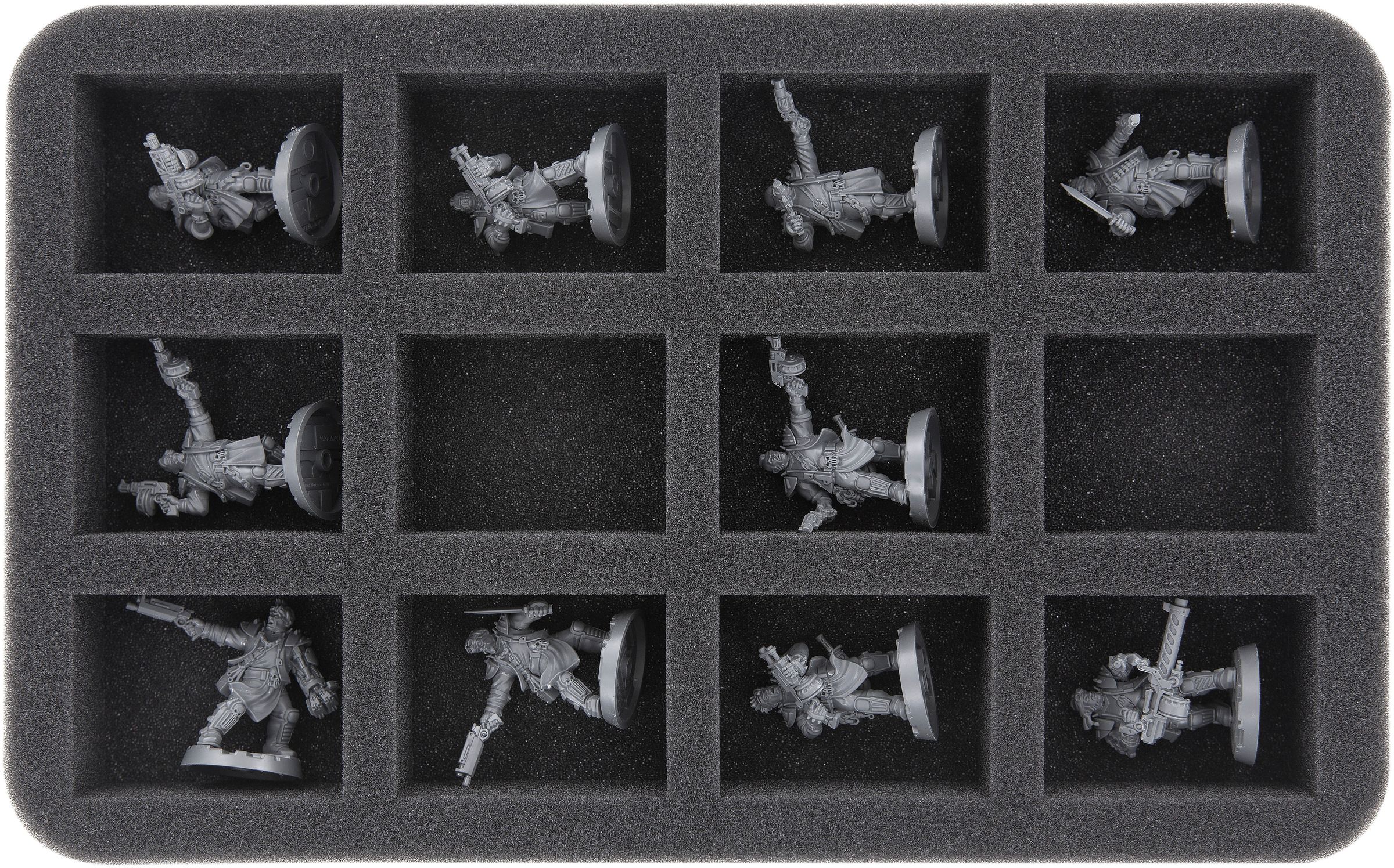 Diese Schaumstoffeinlage verfügt über 12 passende Fächer für bis zu 12 kleine Miniaturen des Brettspiels Necromunda: Underhives. Die (gleich großen) Fächer haben eine Grundfläche von 54 mm x 41 mm. Der hochwertige Schaumstoff schützt sowohl vor Abbruch von Teilen, als auch vor eventuellen Lackabplatzungen.