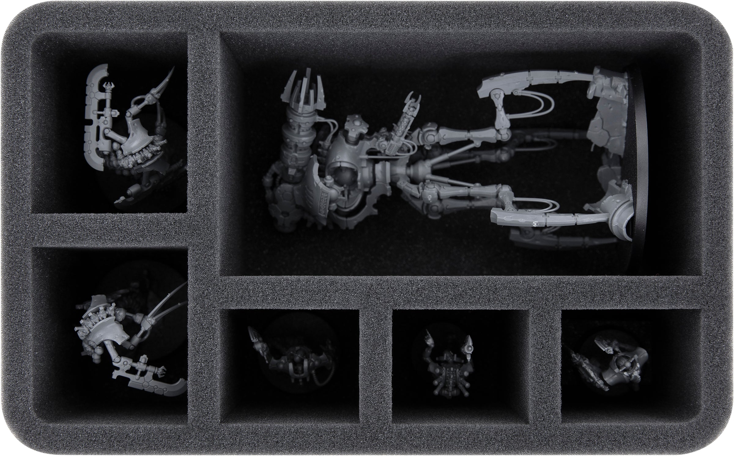 - 2 Half-Size-Schaumstoffeinlagen mit je 6 Fächern für z.B. Kanoptech Dominatorschreiter (Doomstalker), Skorpekh Destruktoren und Charakterminiaturen auf Bases bis zu 40 mm wie z. B. Imothek the Stormlord, Nemesor Zahndrekh oder Immortals (HS100A006)