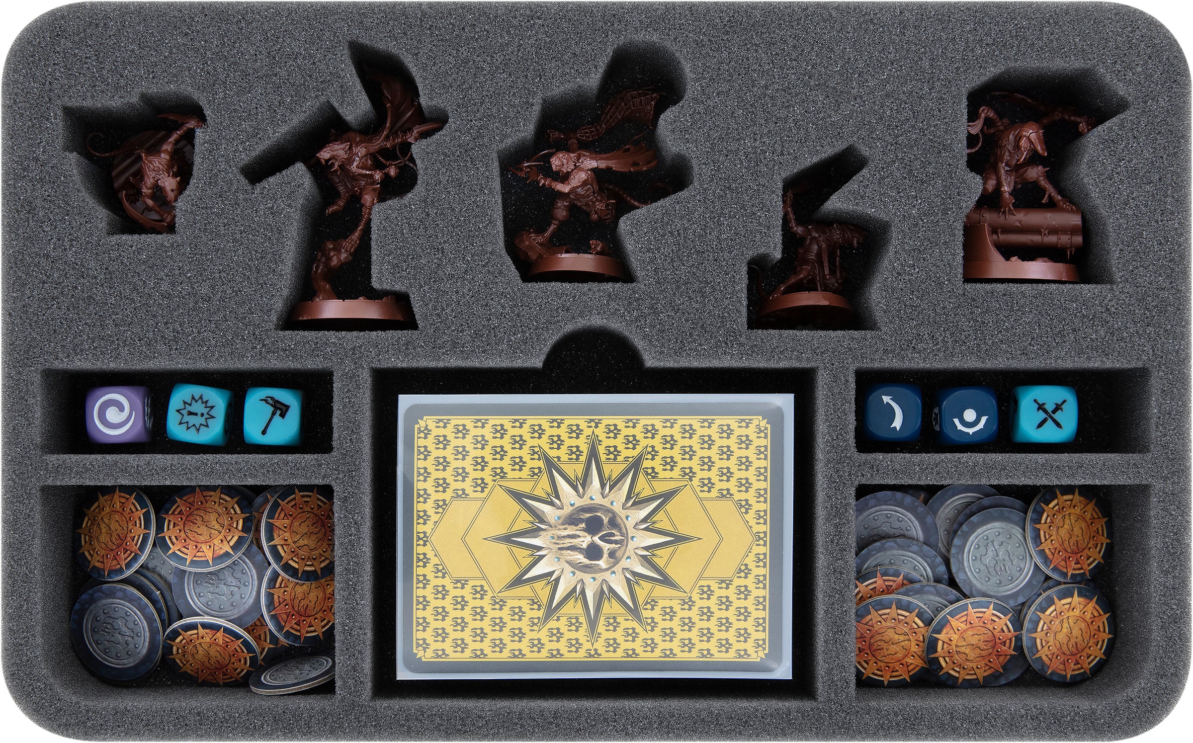 Unter den Miniaturen ist ein weiteres Fach für die Karten reserviert. Es ist mit einer fingerbreiten Aussparung versehen, damit du die Decks leichter herausbekommst. Bis zu 40 Stück passen hier, selbstverständlich auch mit Sleeves, hinein. Das Fach ist groß genug, dass auch eine Nethermaze Deckbox hineinpasst. Würfel und Marker sortierst du in die restlichen vier Fächer ein.