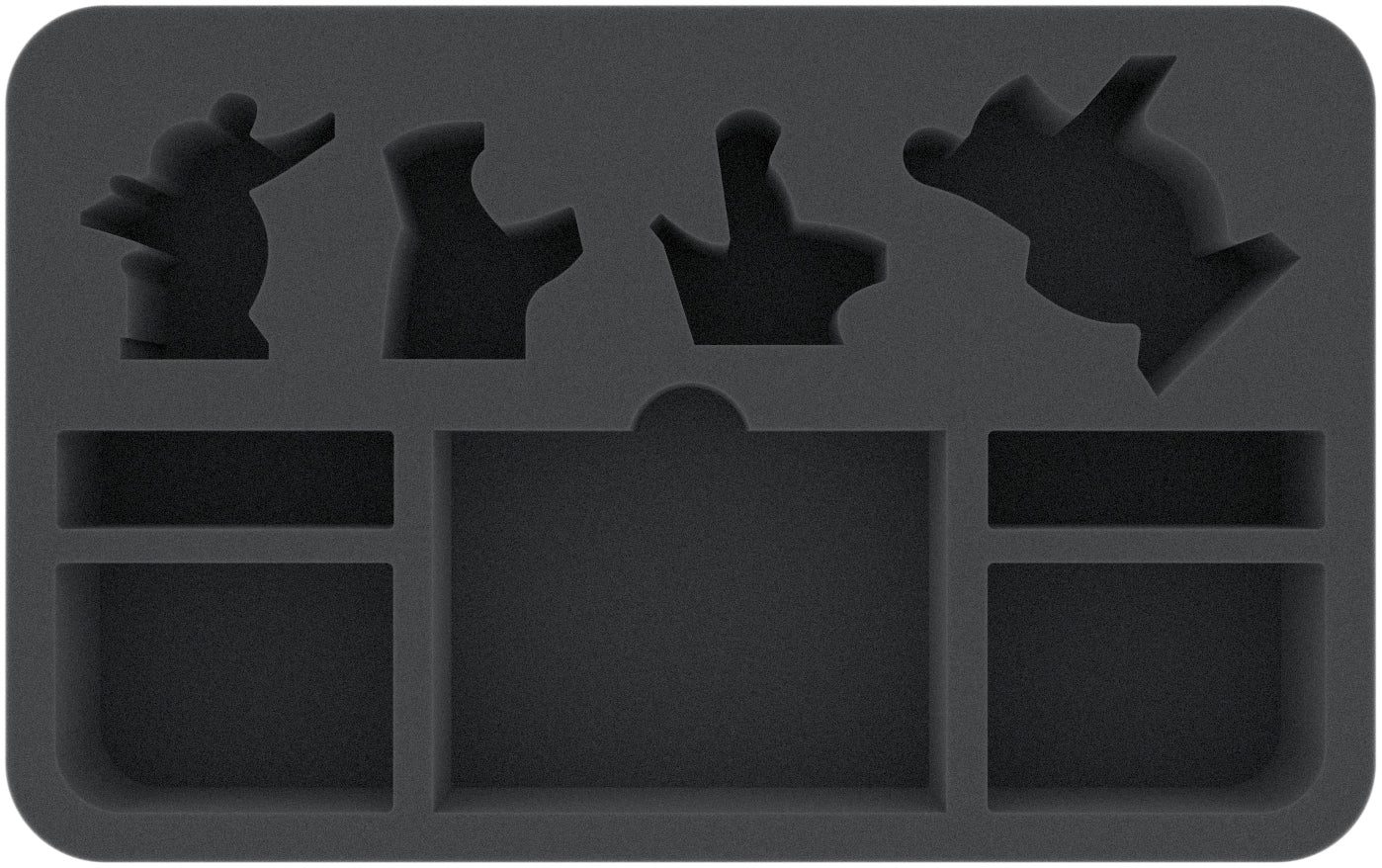 Die 4 Krieger der Schattenschar bekommen hier miniaturengenau geschnittene Fächer zugeteilt. Die Miniaturen sind so, sicher eingebettet in weichen Schaumstoff, bestens für den Transport zum Spieltisch vorbereitet. Dolche, Bögen und alle anderen empfindlichen Details bleiben dadurch unversehrt und jederzeit einsatzbereit.