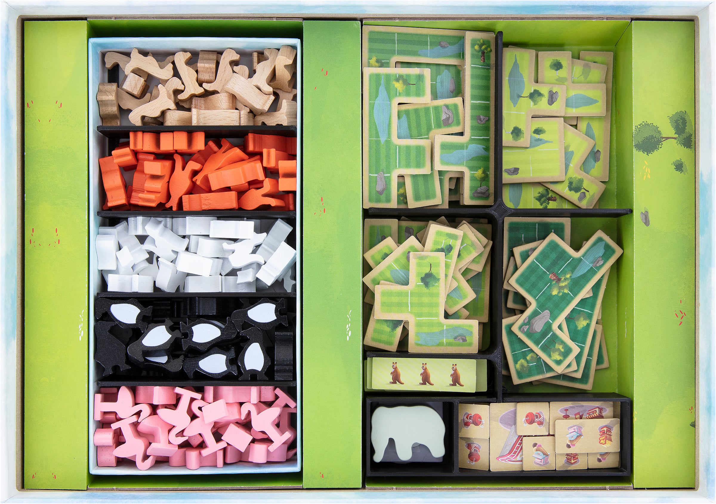Alle Holztiere, Marker und Plättchen bekommen jeweils ein passendes Fach. Damit sparst du dir zeitraubendes Vorsortieren und kannst die gewonnene Zeit direkt in den Ausbau des Zoos stecken.
