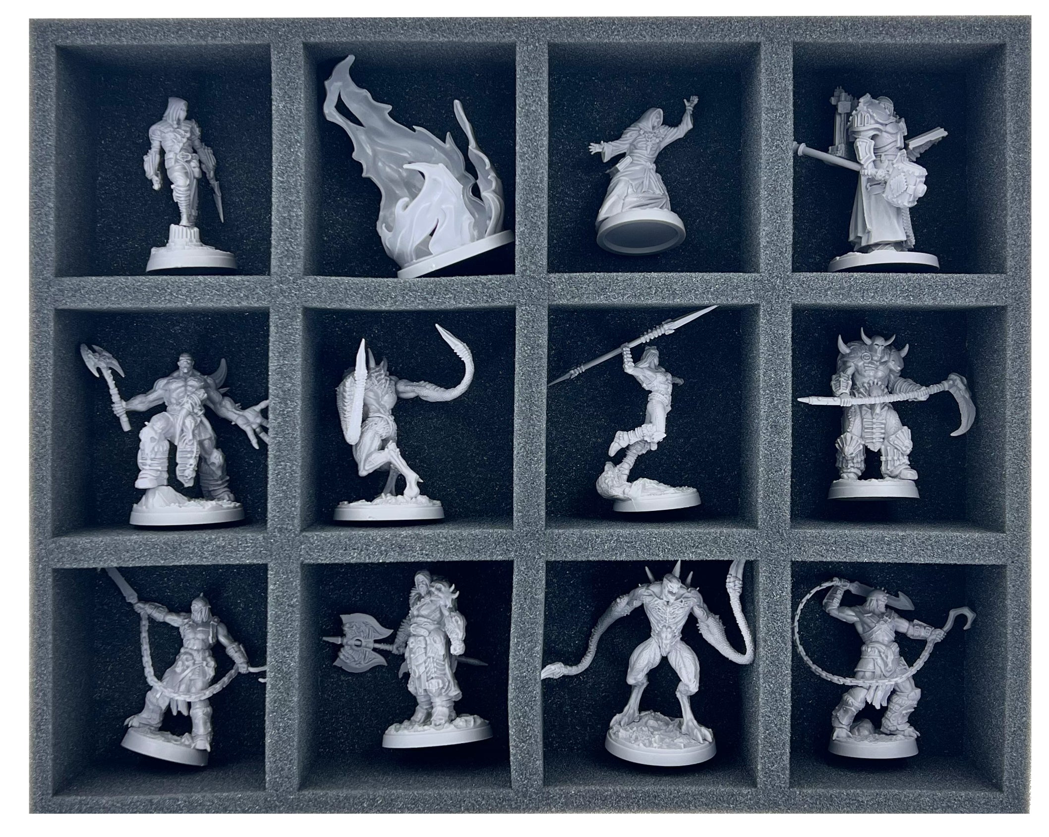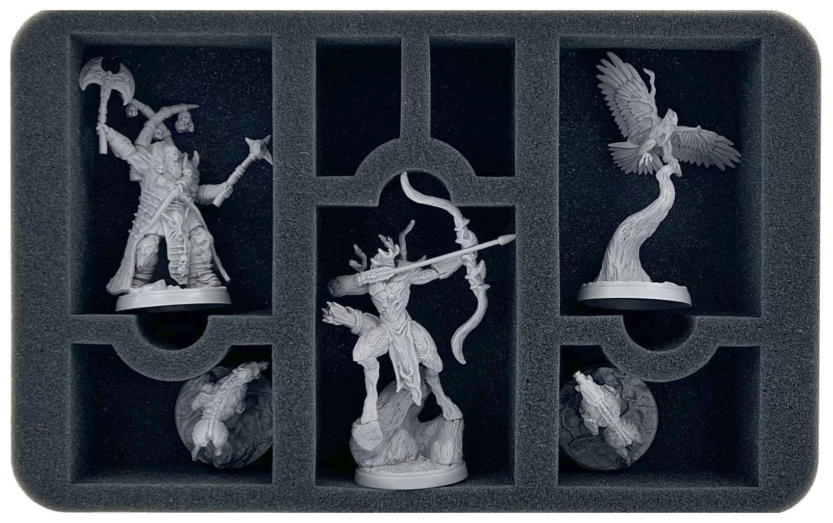 Egal, ob es sich um eine kleine, mittlere oder eine große Figur handelt, jede Miniatur aus den 20 Boxen bekommt ein passendes Fach. Aufgrund des passgenauen Zuschnitts rutschen die Figuren nicht umher und verbleiben selbst beim Transport durch den tiefsten Wald an ihrem Platz.