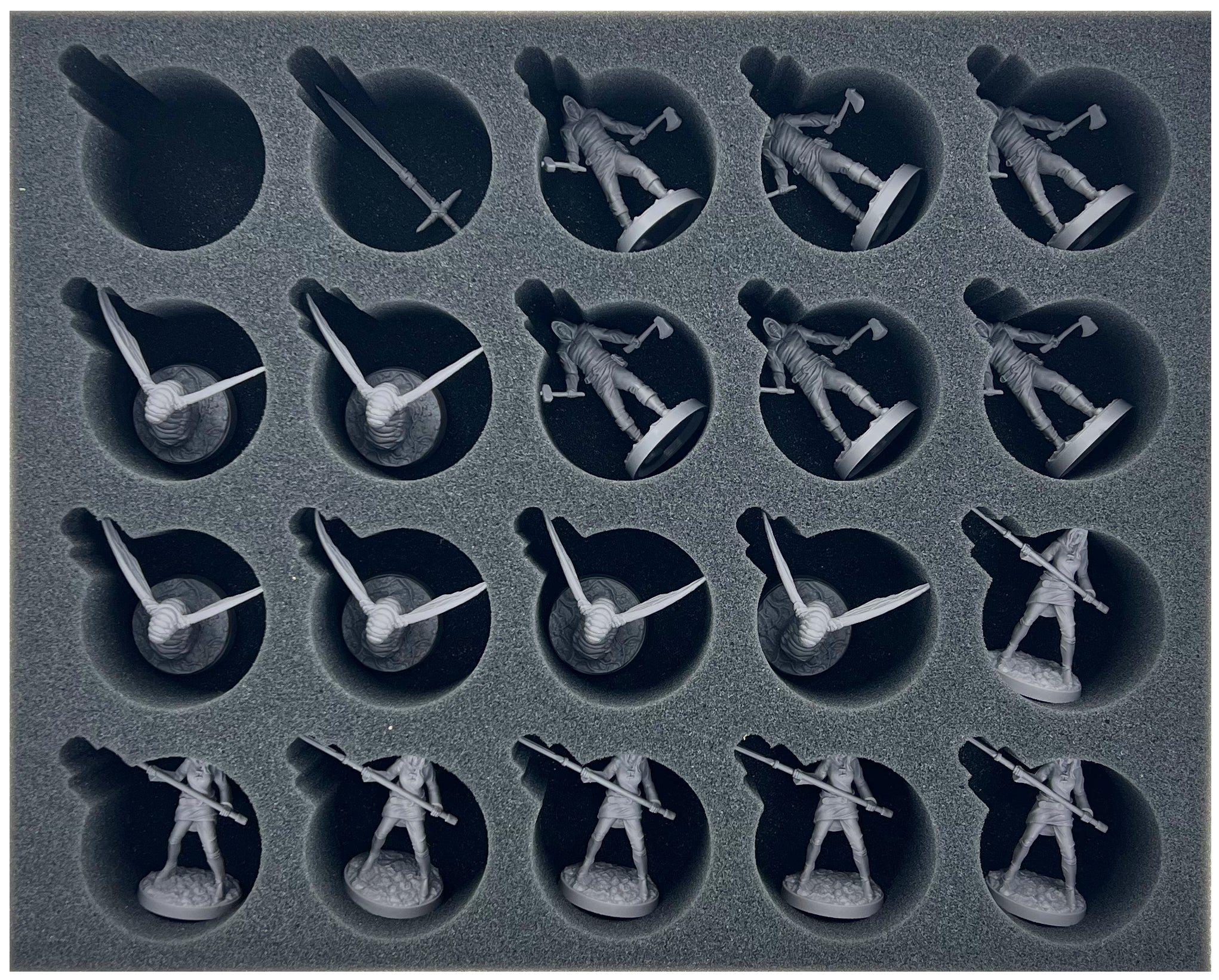 - 1 Full-Size Schaumstoffeinlage mit 20 runden Fächern für Standardminiaturen und Waffen (FSMESZ060BO)