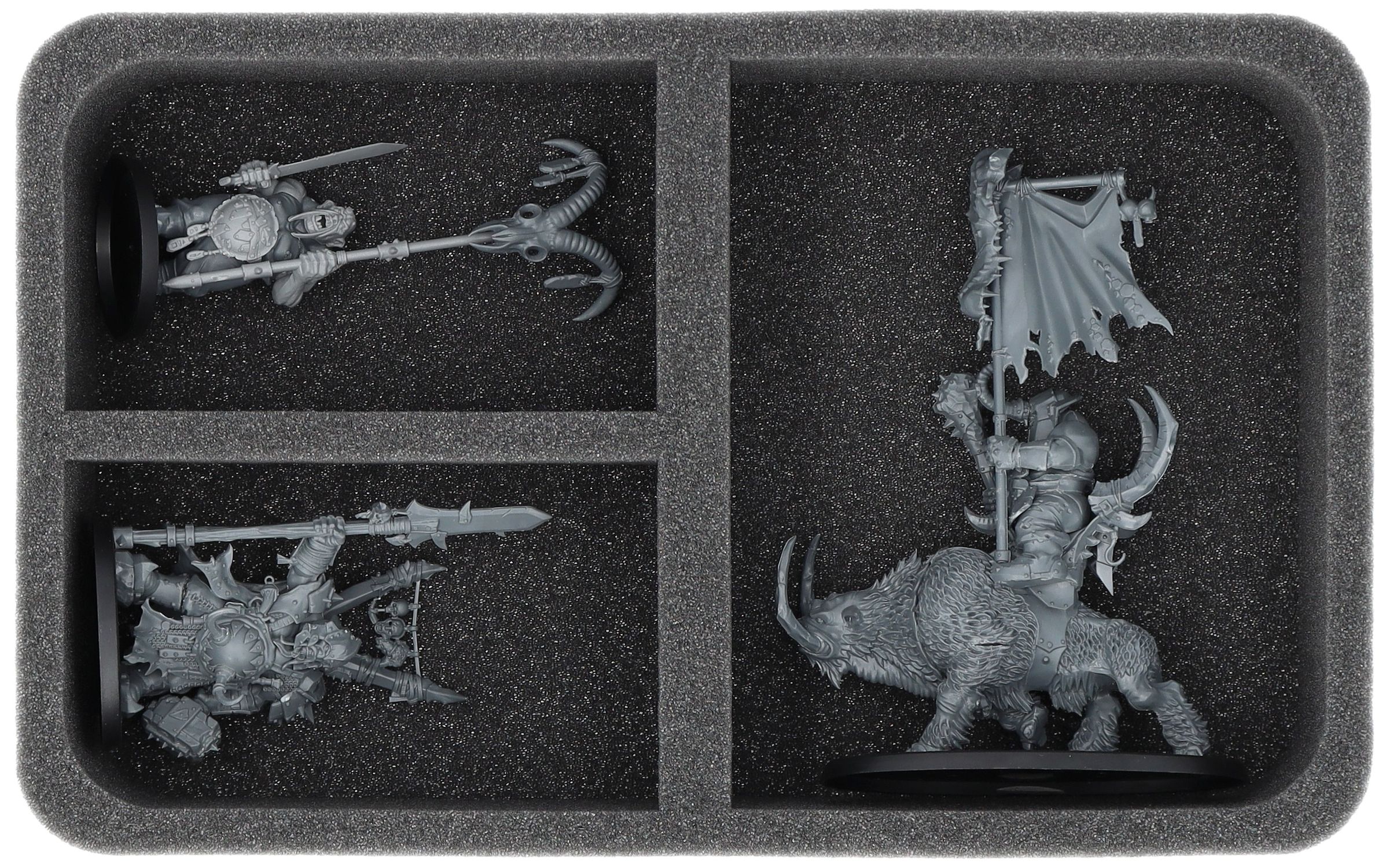 Auf dieser Feldherr Schaumstoffeinlage hast du Platz für bis zu 3 Miniaturen deiner Armee. Das Insert eignet sich zum Beispiel besonders gut zum Aufbewahren der Leadbelchers mit Standarte, Gluttons mit Standarte, Trauerfangreiter und Modellen mit ähnlichen Abmessungen.
