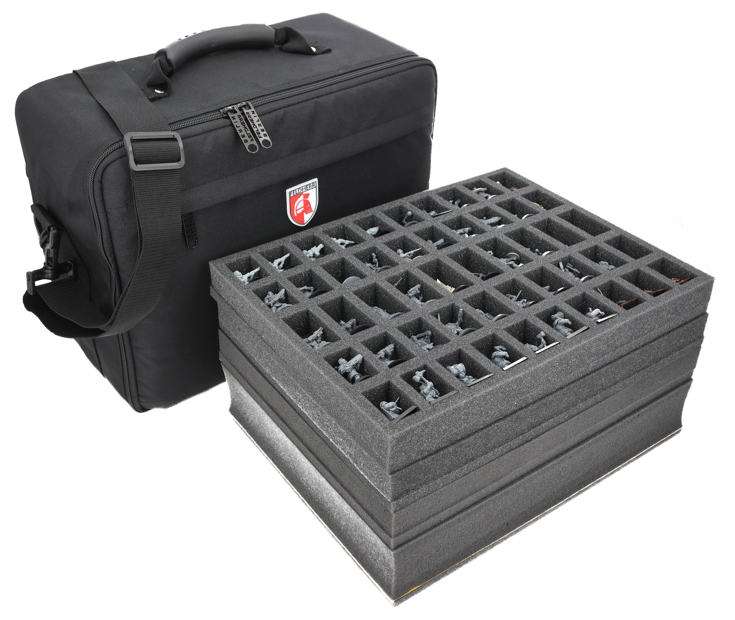 Feldherr Miniaturentasche für 150 Figuren und viele große Panzer oder Monster. Die Tasche wird mit 4 Schaumstoffeinlagen geliefert. In der 60 mm hohe Rasterschaumstoffeinlage lassen sich Panzer, Monster oder andere große Figuren problemlos verstauen. Der Rasterschaum lässt sich dabei ohne Werkzeug an nahezu jede Figurenform anpassen. In die 3 Einlagen für jeweils 50 Figuren passen nahezu alle Figuren - wie zum Beispiel für die Spiele Warhammer Fantasy, 40.000 oder Herr der Ringe - die auf einer 25mm Base (Platte) stehen.