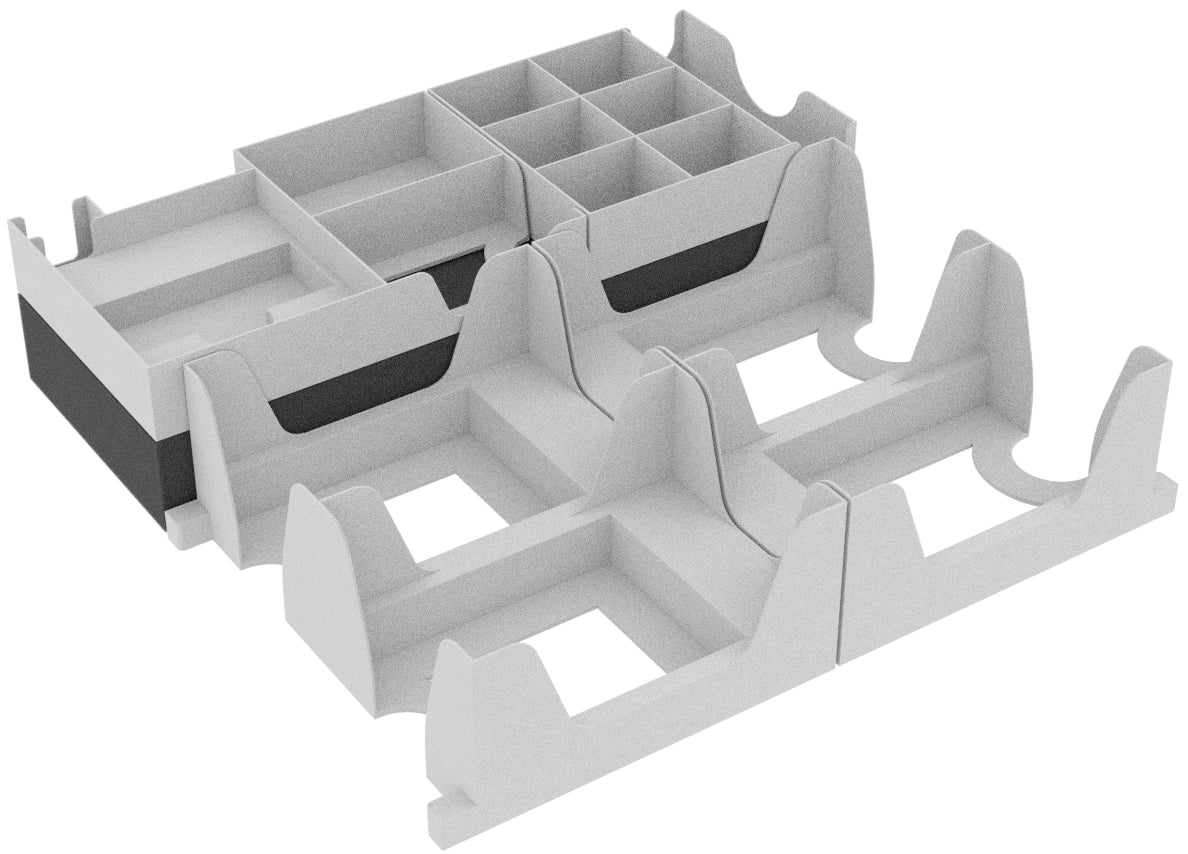 In den Token- und Kartenhalter lassen sich sämtliche Spielmaterialien des Grundspiels und beider Erweiterungen kompakt und übersichtlich einsortieren.