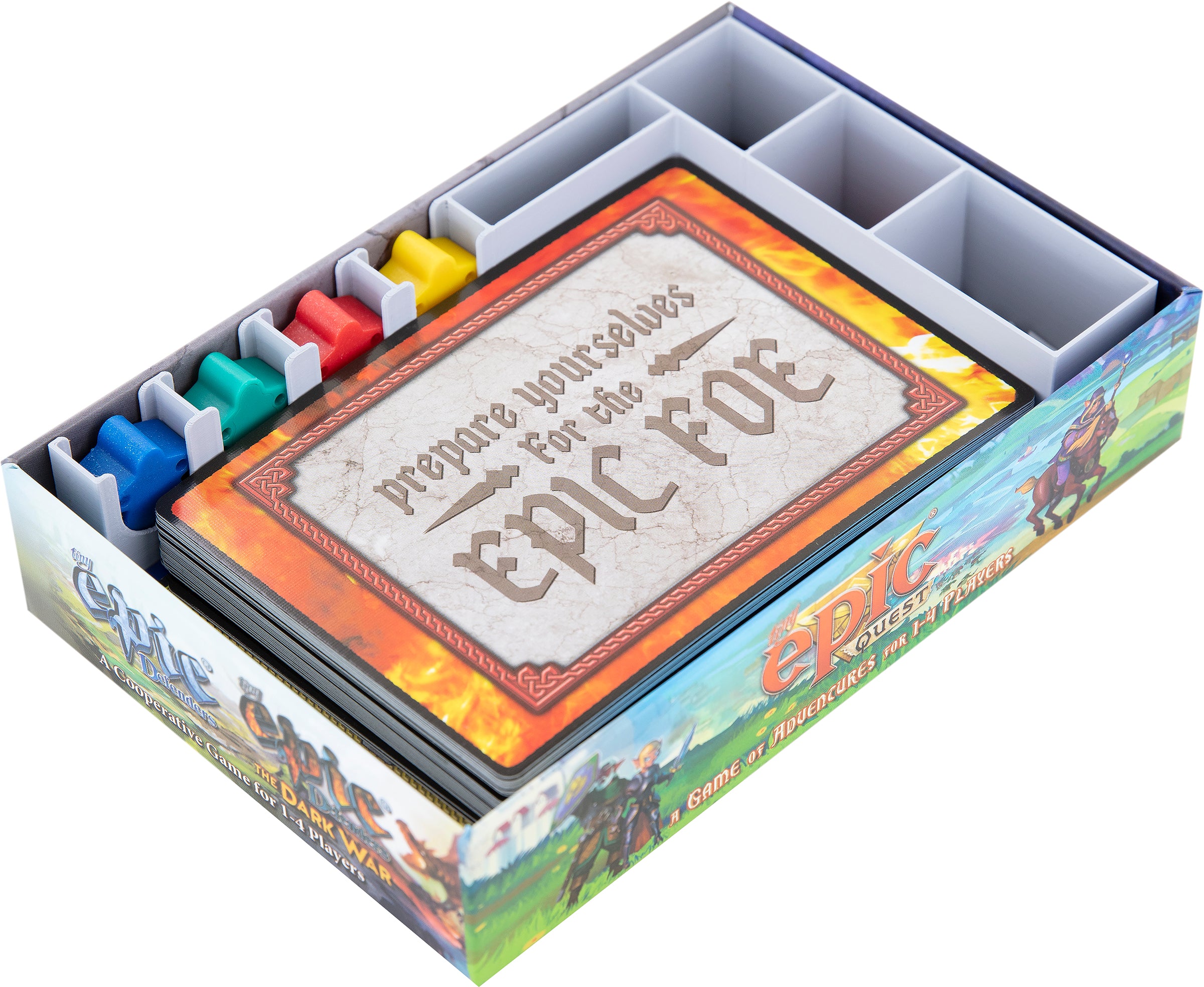 Der Einsatz bietet acht Fächer für Defender ITEMeeple, Defender Hit Point Tokens, den Epic Foe Hit Point Token, die Threat Token und die Artifact Items.