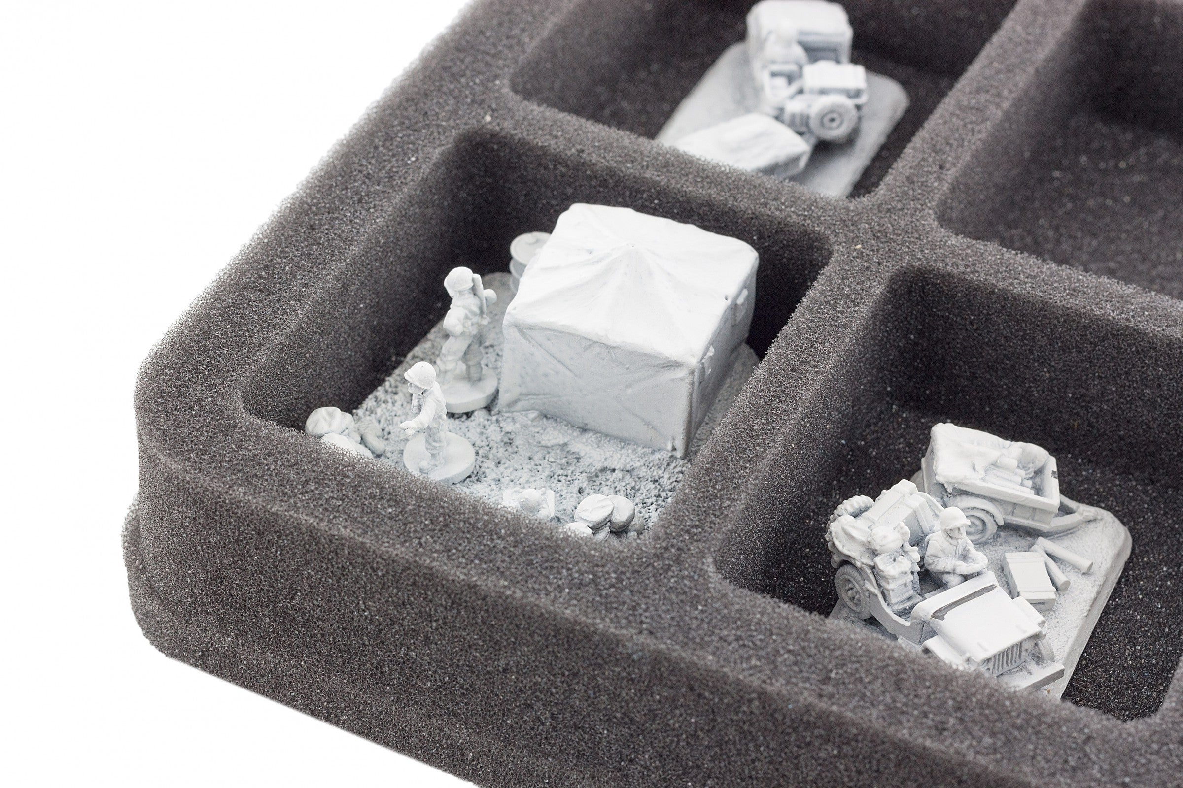 Spezielle Flames of War Schaumstoffeinlage für 8 Large Bases / Artillerie Bases. Die 35 mm Stärke der Matte ergibt sich aus der Nutzhöhe von 25 mm und dem angeklebten 10 mm Boden.