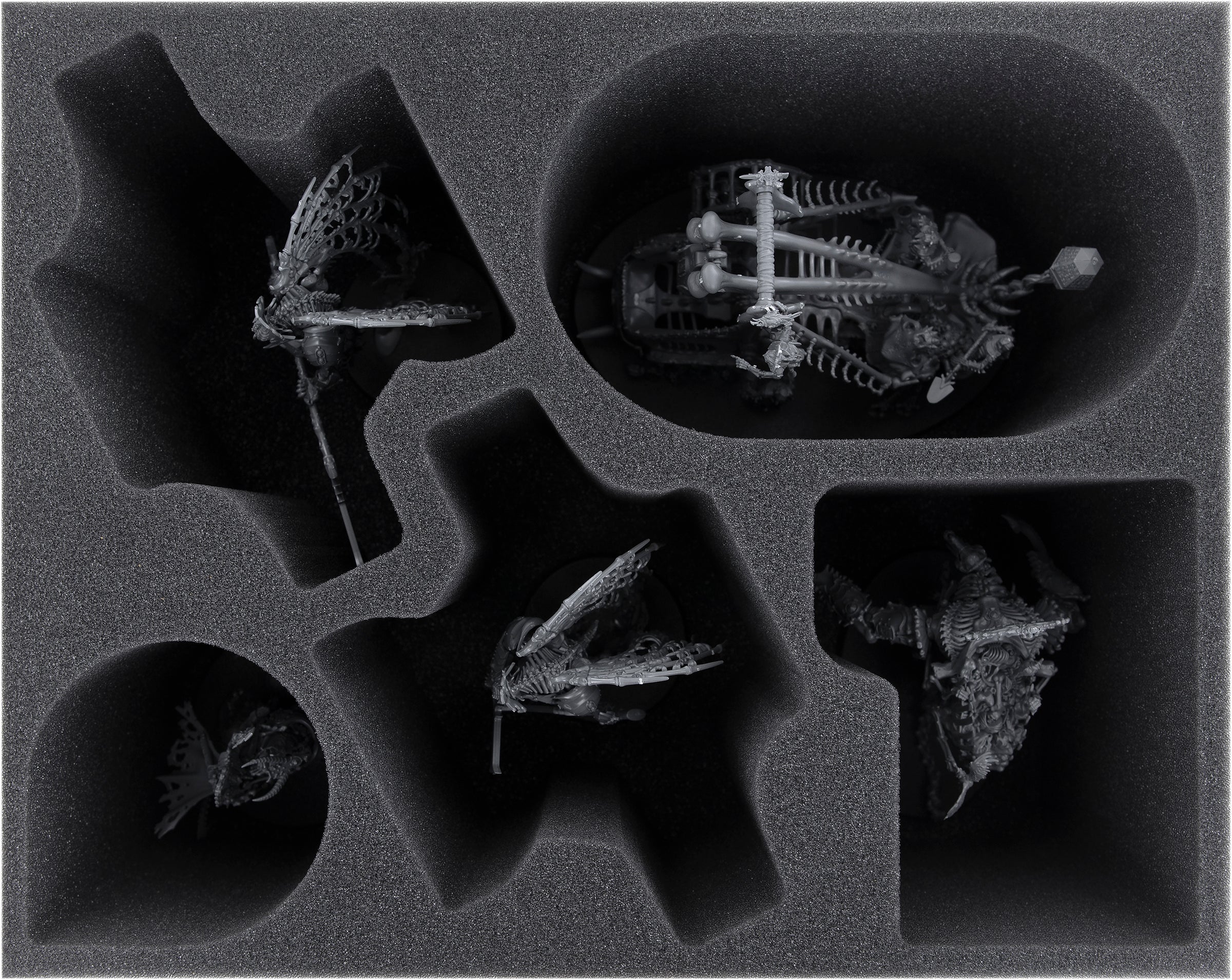 Das 130 mm hohe Insert bietet mit insgesamt fünf maßgeschneiderten Fächern Platz für die folgenden Modelle der Ossiarch Bonereapers: