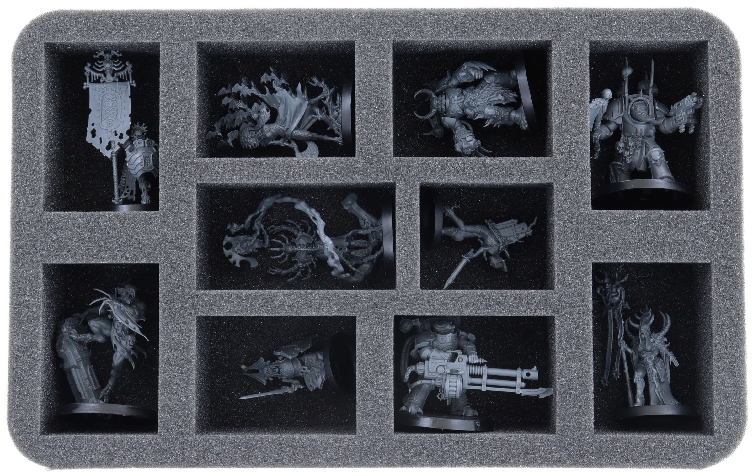 Auf dieser Feldherr Schaumstoffeinlage hast du Platz für bis zu 10 Miniaturen deiner Armee. Das Insert eignet sich zum Beispiel besonders gut zum Aufbewahren von Charaktermodellen wie Mortisan-Knochenbildner, Vokmortian, Master of the Bone-tithe und Miniaturen mit ähnlichen Abmessungen.