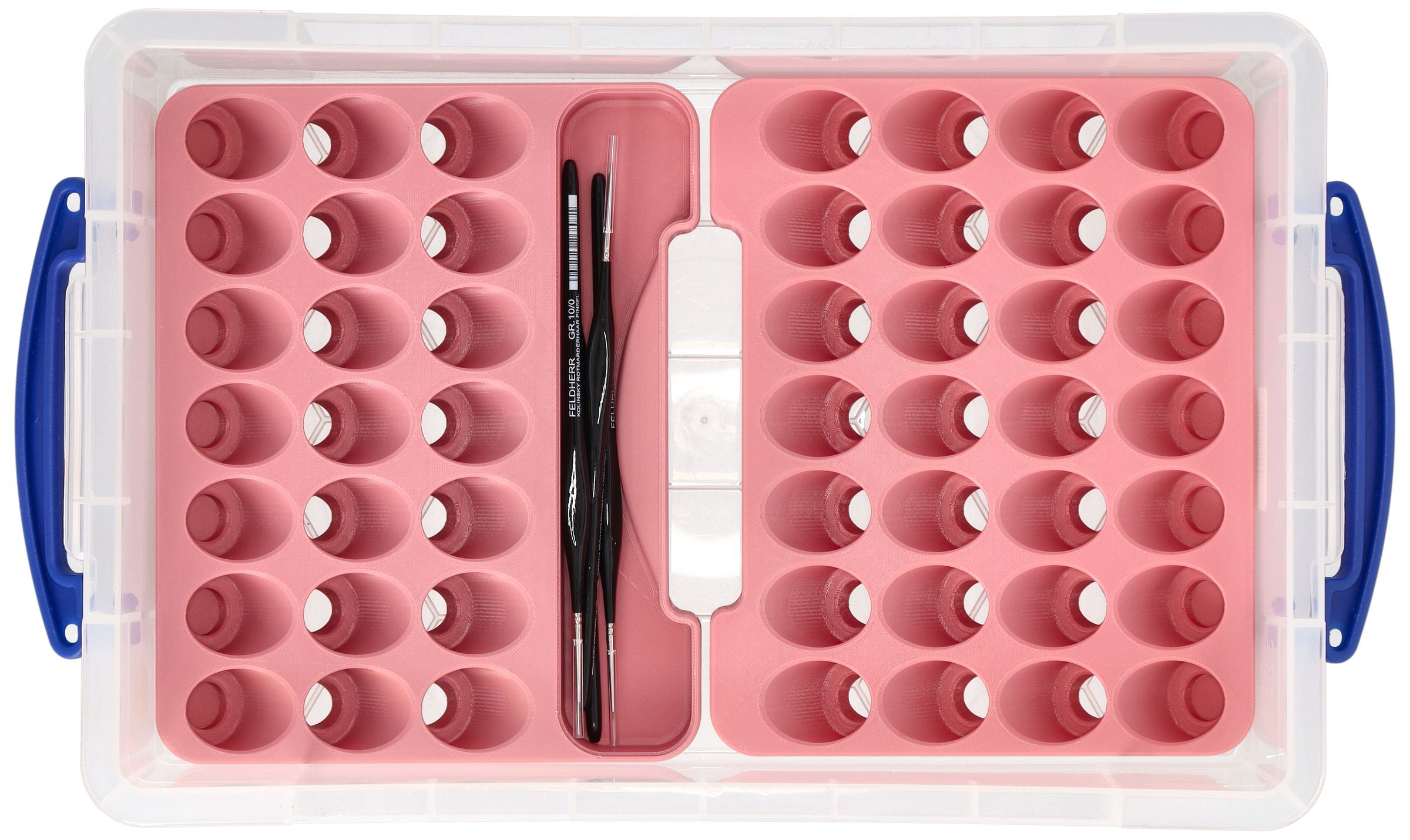 • Ein Insert mit 28 runden Fächern für Farbfläschchen