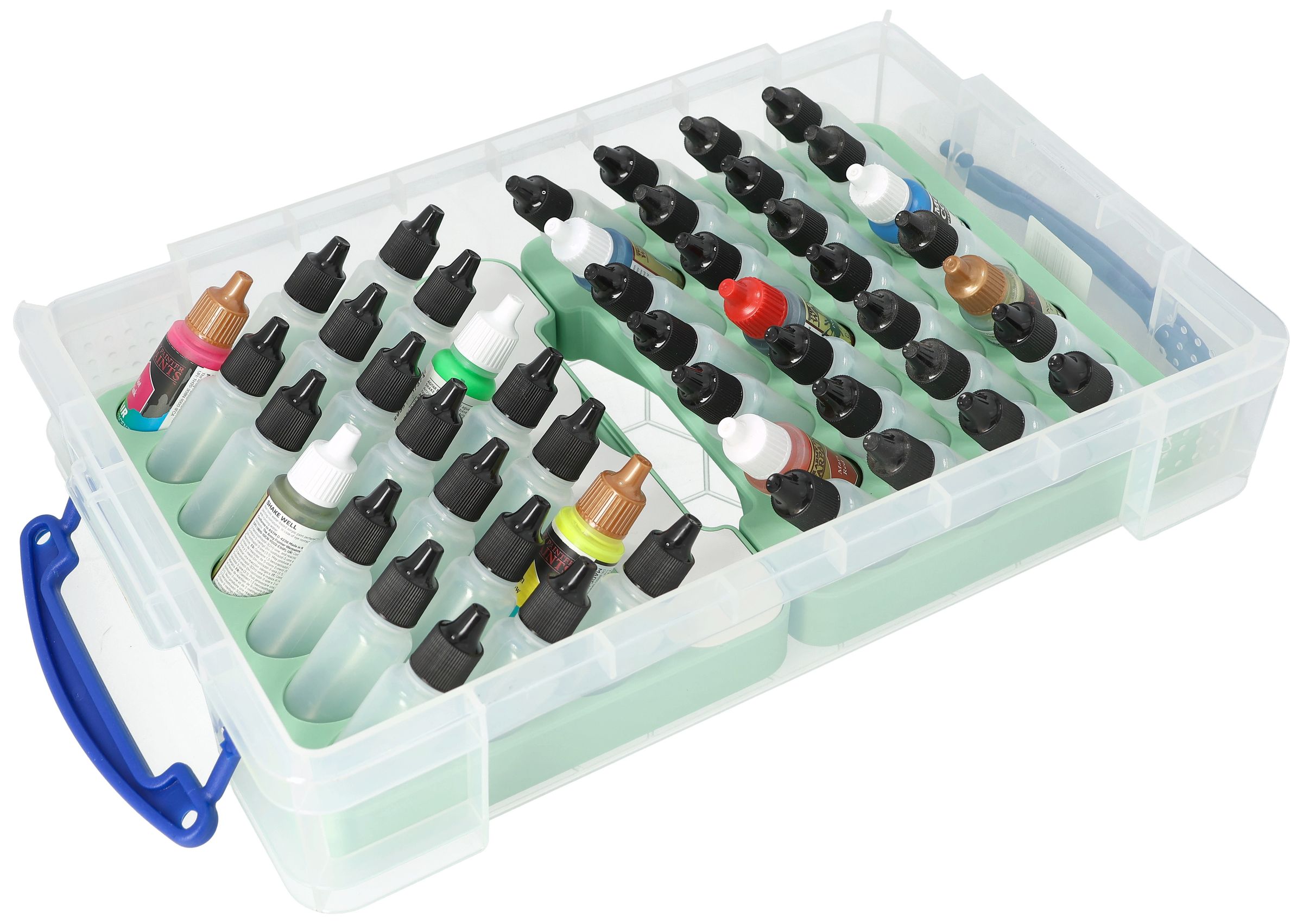 Mit ein paar Farben und Figuren fing es an - doch nun ist aus deiner anfänglichen Auswahl eine bunte Sammlung geworden, und die Dropper Bottles rollen fröhlich über den Tisch. Damit die Farbfläschchen auch wissen wo sie hingehören, kommt hier das passende Komplettset: Mit zwei maßgeschneiderten Farbhaltern und einer stabilen 4l Really Useful Box bringst du Ordnung ins kreative Chaos - kompakt, griffbereit und sicher transportierbar.