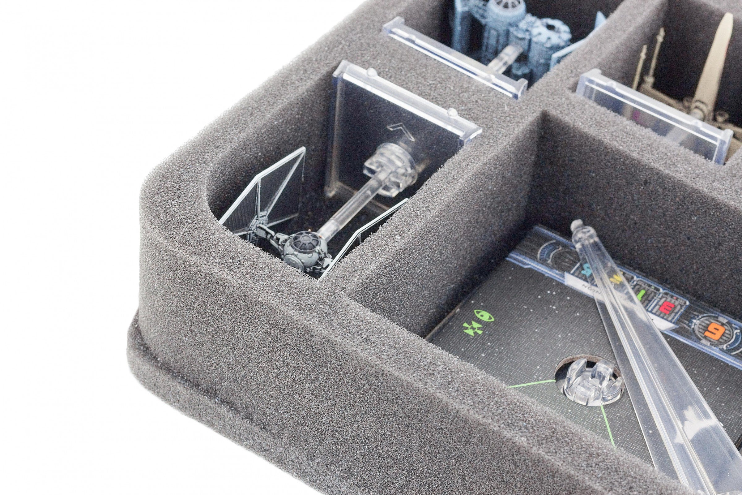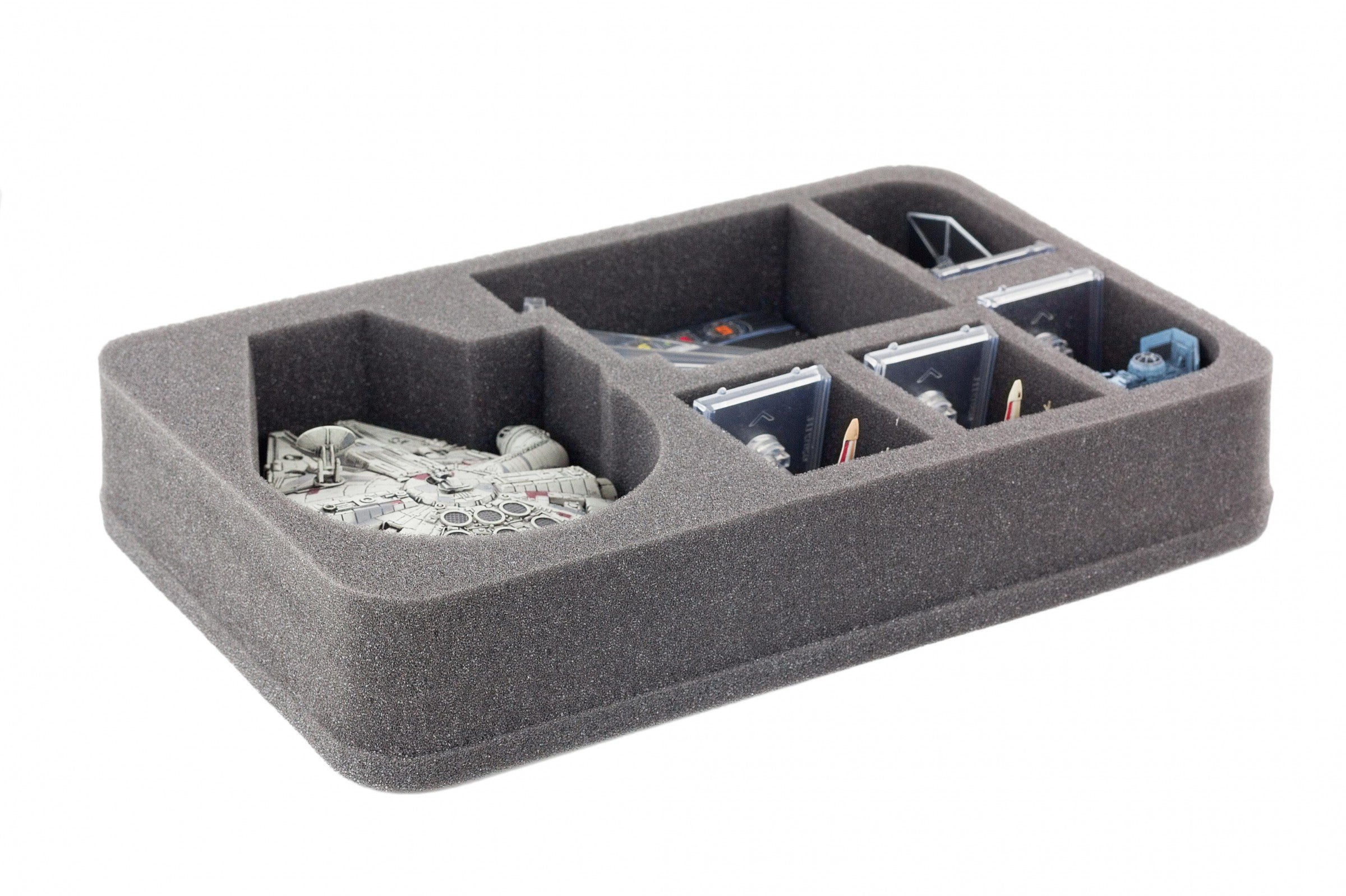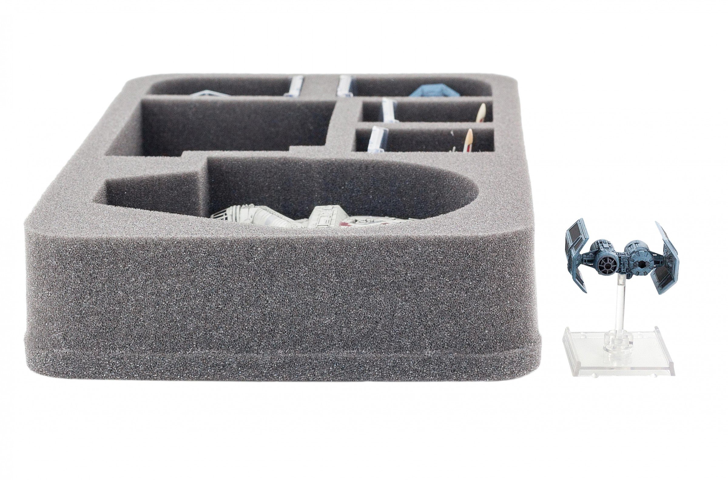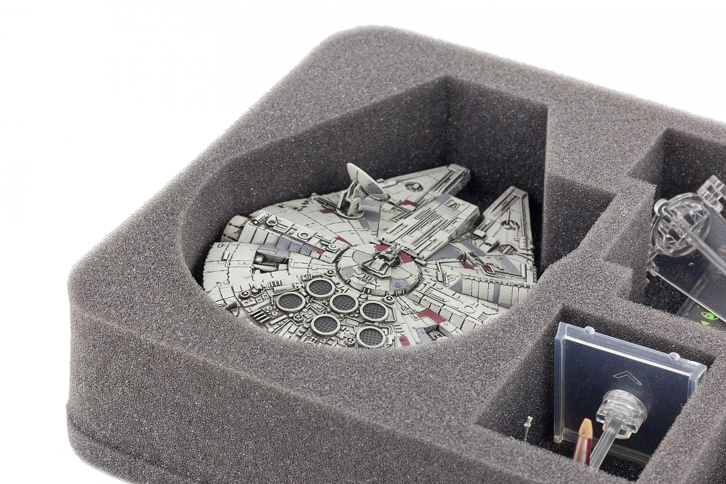 Speziell für den Star Wars X-Wing Millennium Falken geschnittene Schaumstoffeinlage. In dieser Einlage findet nicht nur der Millennium Falke sicher Platz, sondern auch das Zubehör, wie Bases, Token, Ständer und es bleibt noch Platz für X-Wing Raumschiffe wie den HWK-290, Tie Fighter und andere.