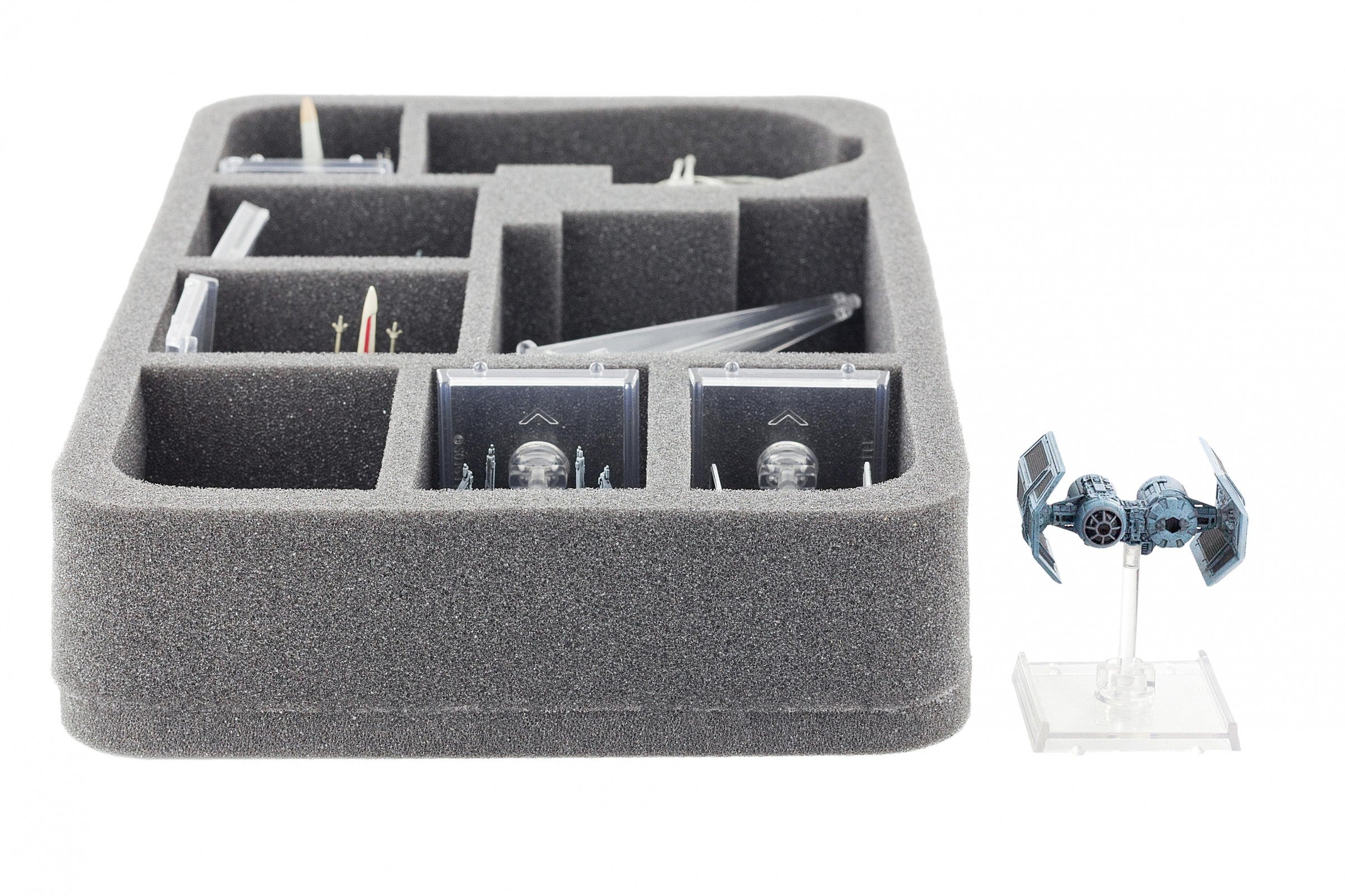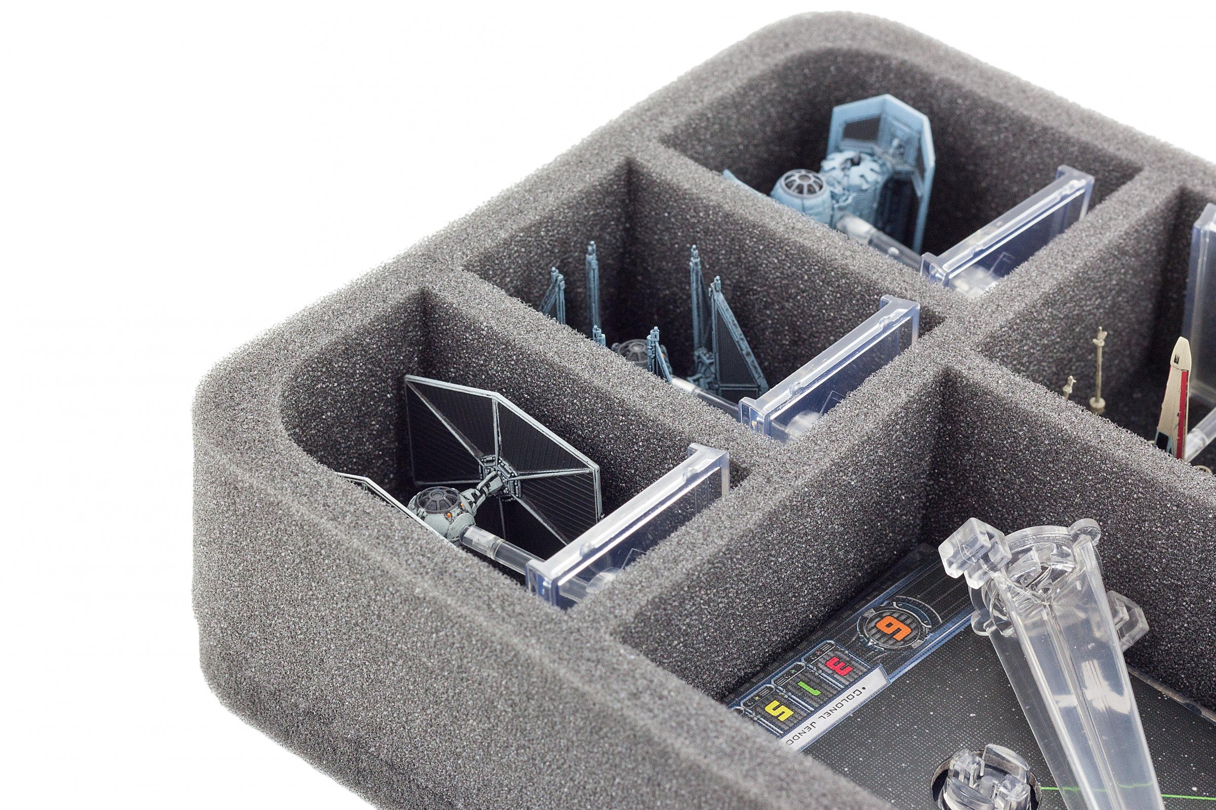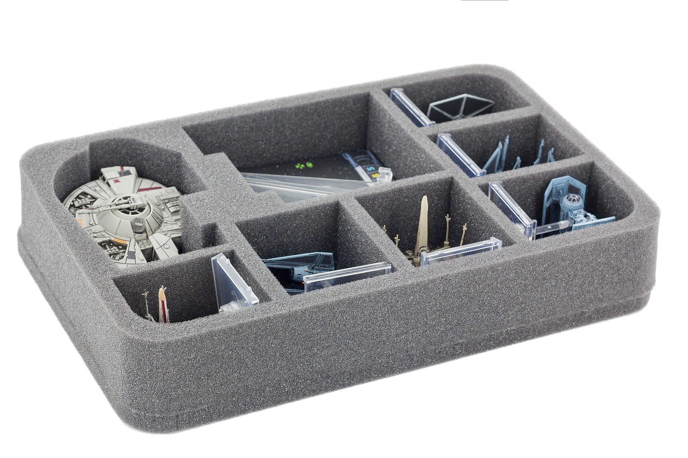 Speziell für den YT-2400 Frachter geschnittene Schaumstoffeinlage. In dieser Einlage findet nicht nur der YT-2400 Frachter sicher Platz, sondern auch das Zubehör, wie Bases, Token, Ständer und es bleibt noch Platz für X-Wing Raumschiffe wie den HWK-290, Tie Fighter, Klon-Z-95-Sternenjäger und andere.