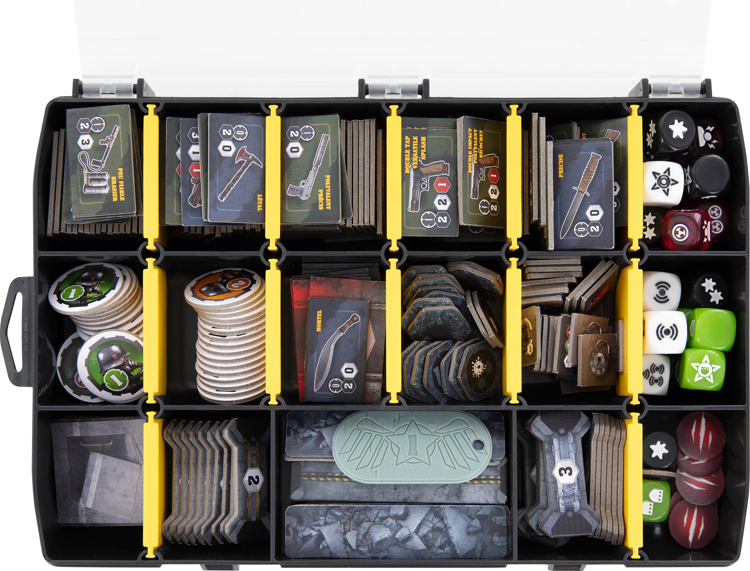 Individuelle Einlagen mit speziellen Fächern für die Karten, sowie zwei Sortimentskästen für kleinteiliges Spielmaterial, wie Würfel, Token und Items, helfen dir dabei, auch beim Spielmaterial jederzeit die Übersicht zu behalten. Alien Items, Wound Tokens und Action Cards sind dadurch schnell zur Hand und die Zeit und Nerven, die du für den Spielaufbau sparst, kannst du stattdessen in deine Missionen investieren.