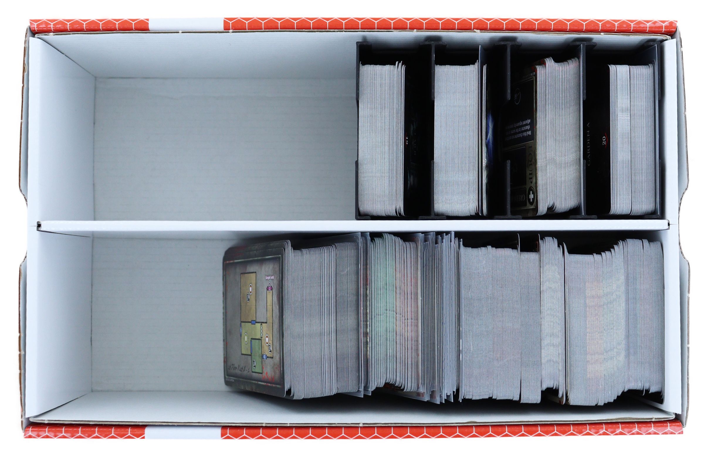 Eine Trennwand in der Mitte der Box unterteilt diese in zwei gleich große Fächer. So lassen sich die Karten ordentlich aufreihen, ohne dass sie sich während des Transports miteinander vermischen.