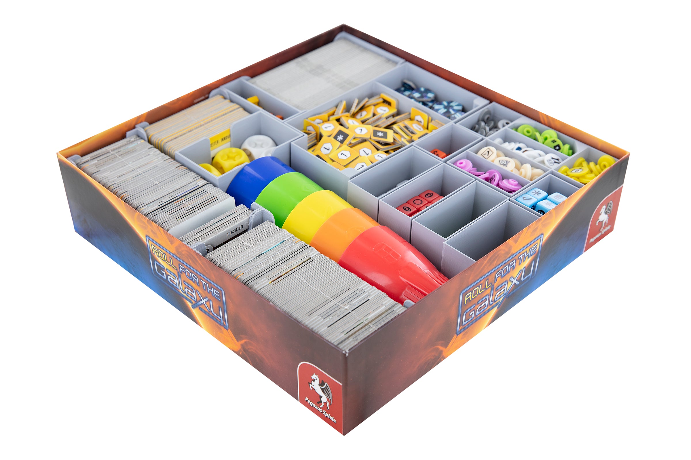 - Der Organizer bietet Platz für alle Spielmaterialien aus dem "Roll for the Galaxy"-Grundspiel und den beiden Erweiterungen "Große Konkurrenz" und "Der große Traum" von Pagesus Spiele.