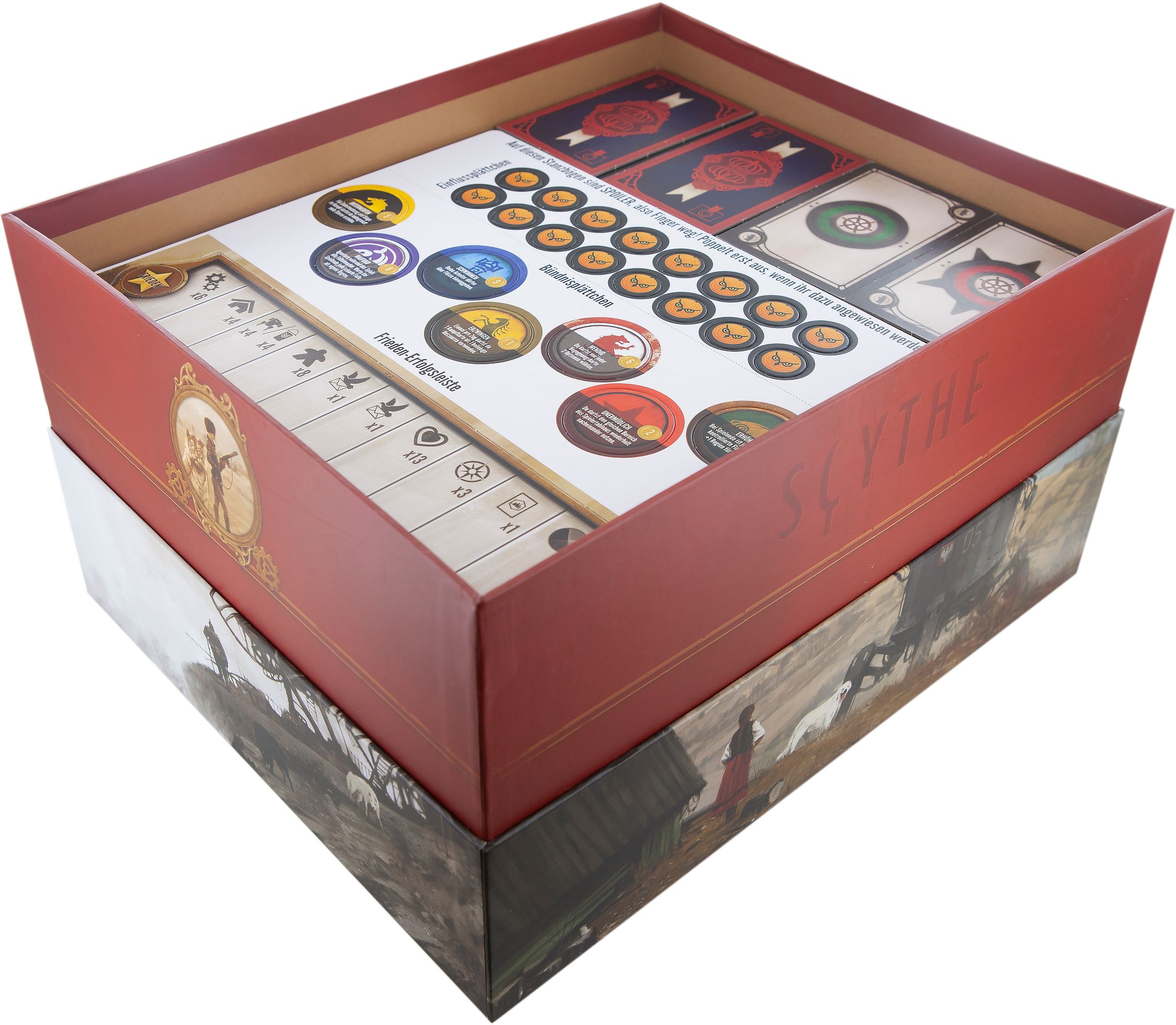 Insgesamt 3 Einlagen helfen dir dabei, selbst nach 3 Erweiterungen noch den Überblick über deine Scythe-Kollektion zu behalten.