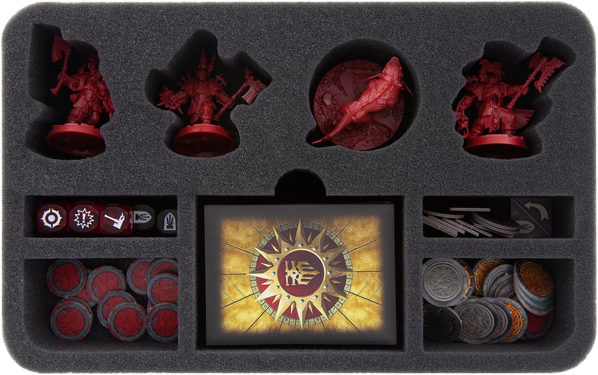 Diese Kriegerschar für Warhammer Underworlds: Shadespire kommt mit drei Miniaturen der schwer gepanzerten Blood Warriors, einem Flesh Hound und dem dazugehörigen Deck aus 60 Karten. Um diese gebührend unterzubringen gibt es von uns die passende Schaumstoffeinlage.