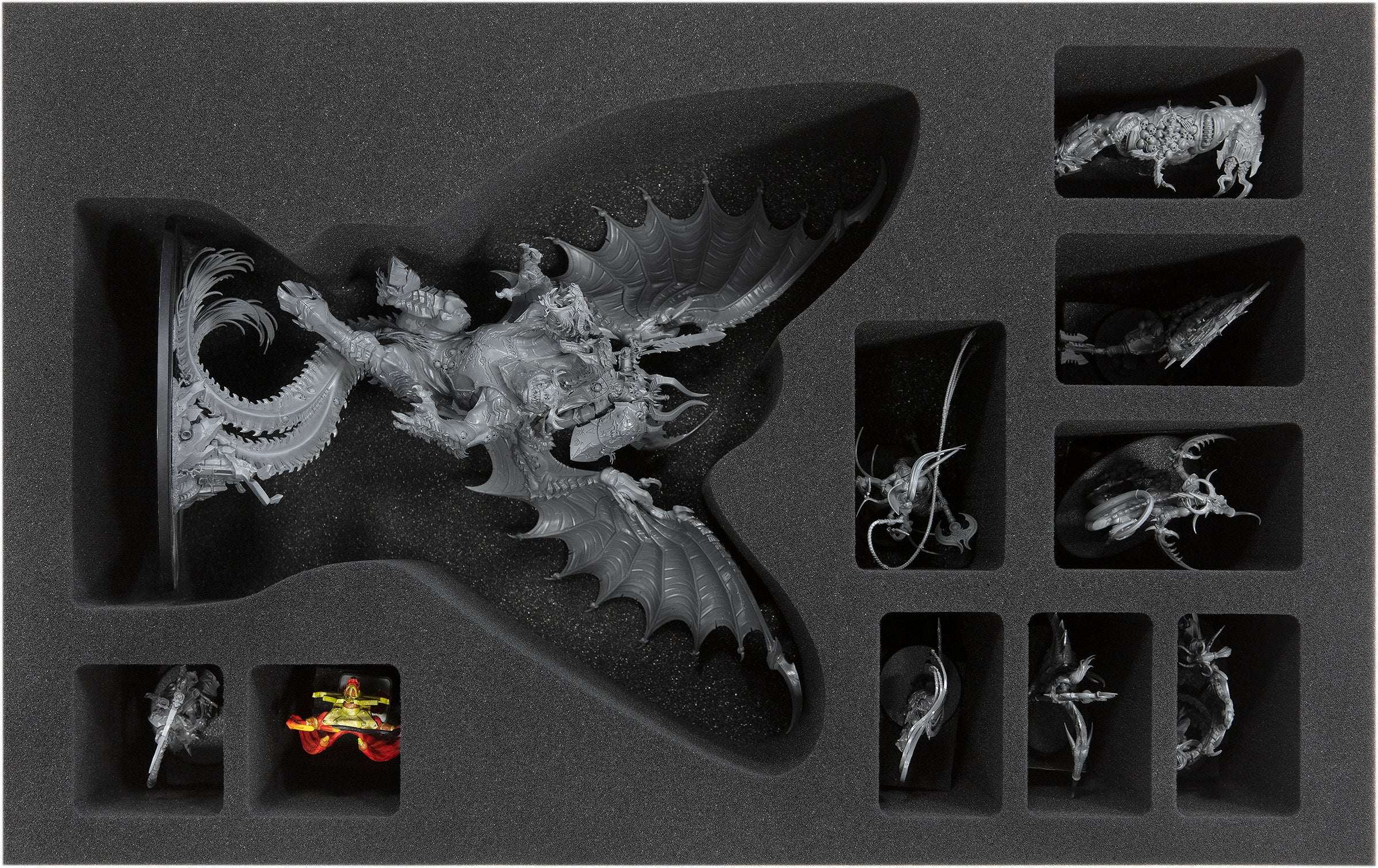 - 2 Full-Size-Schaumstoffeinlagen mit jeweils 6 Fächern für z. B. Grauensritter, Varangarde, Kriegsherr des Chaos auf Karkadrak, Kriegsherr des Chaos auf Dämonischem Reittier (FSMEKU070BO)